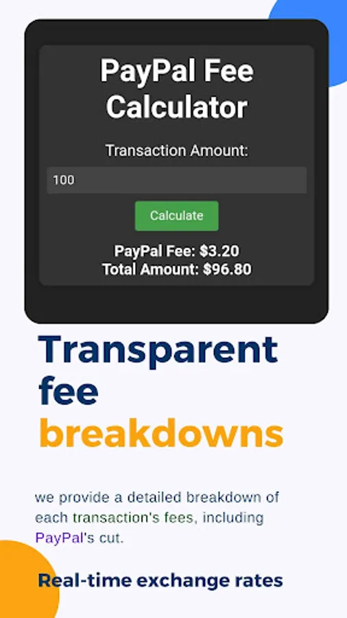 🔄 Real-Time Fee Updates: Our app is always up-to-date with the latest PayPal fee structures, ensuring accuracy in your calculations. We keep track of any changes in commission rates, ensuring you are well-informed at all times.