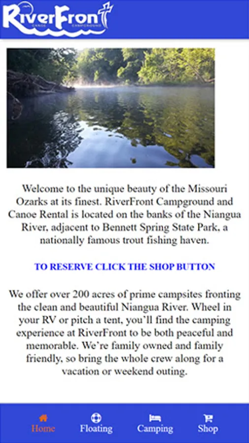 River Front Campground and Canoe Rental is located on the banks of the Niangua River, adjacent to Bennett Spring State Park, a nationally famous trout fishing haven. We offer over 200 acres of prime campsites fronting the clean and beautiful Niangua River. Wheel in your RV or pitch a tent, you’ll find the camping experience at River Front to be both peaceful and memorable. We’re family owned and family friendly, so bring the whole crew along for a vacation or weekend outing.