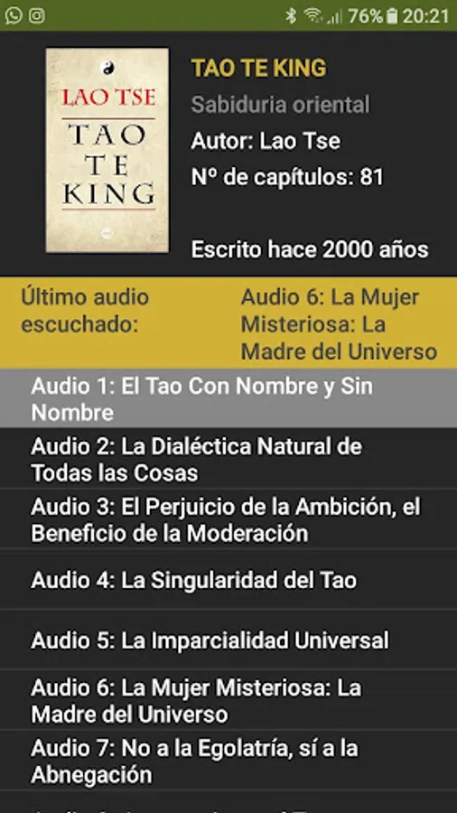 The audiobook of the book Tao Te King by Lao Tse contains the audios in Spanish of its 81 chapters written around the 6th century BC.