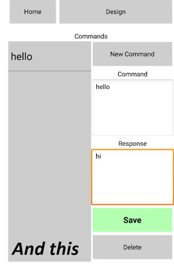 Click the top left button on the home screen. Click on Commands. Click “New command” to create a new command, click save to save that command, and delete to delete that command. To change a command, select it, change the text, and press save. To delete another command, press the command you want to delete and click delete.
