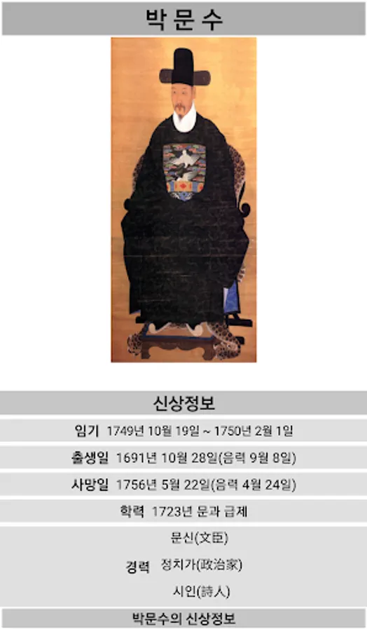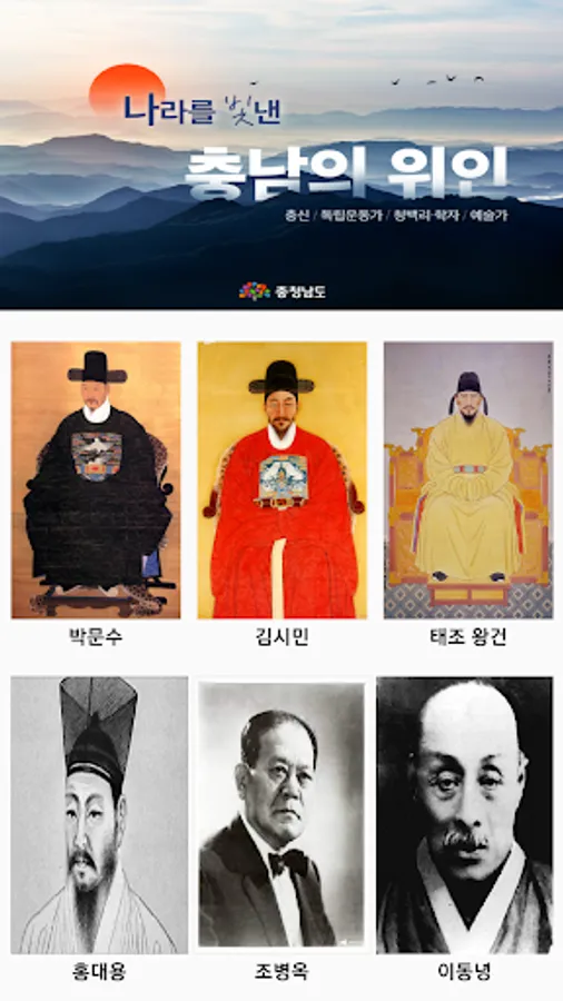 This app contains information about the great men of Cheonan, Park Moon-soo, Hong Dae-yong, Kim Si-min, Jo Byeong-ok, Lee Dong-nyeong, and Taejo Wang-geon.