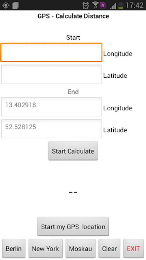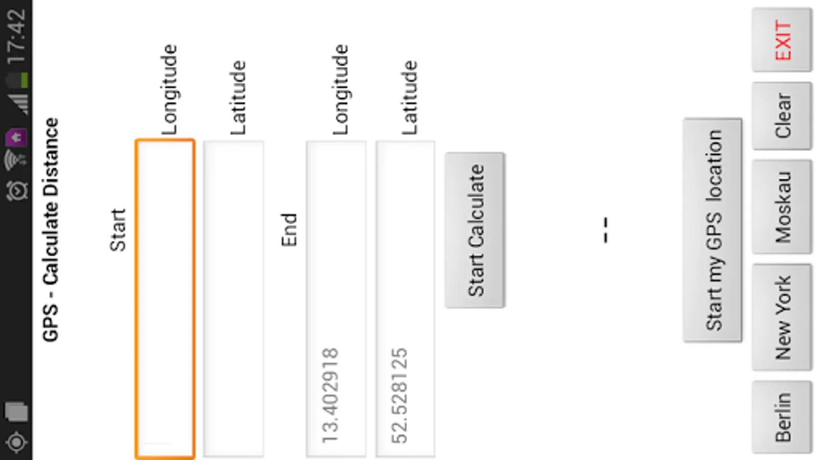 GPS distance calculation application. Enter the latitude and longitude coordinates and measure the distance between any two points on the ground.