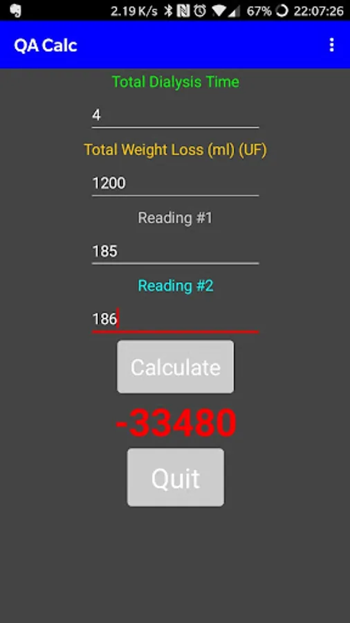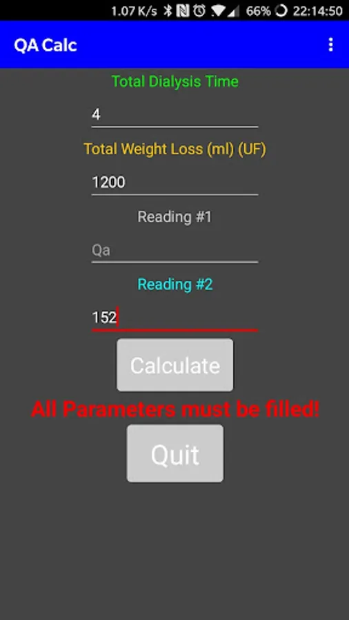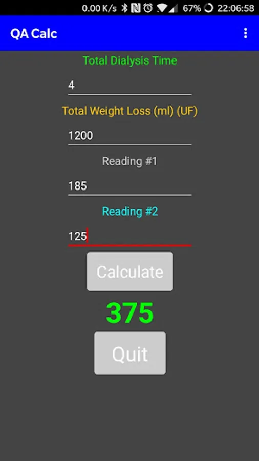 Enter the Dialysing time, Ultrafiltration in ml that the patient is having taken off, the first reading (Qa) and the second reading (Qb) and press "Calculate".