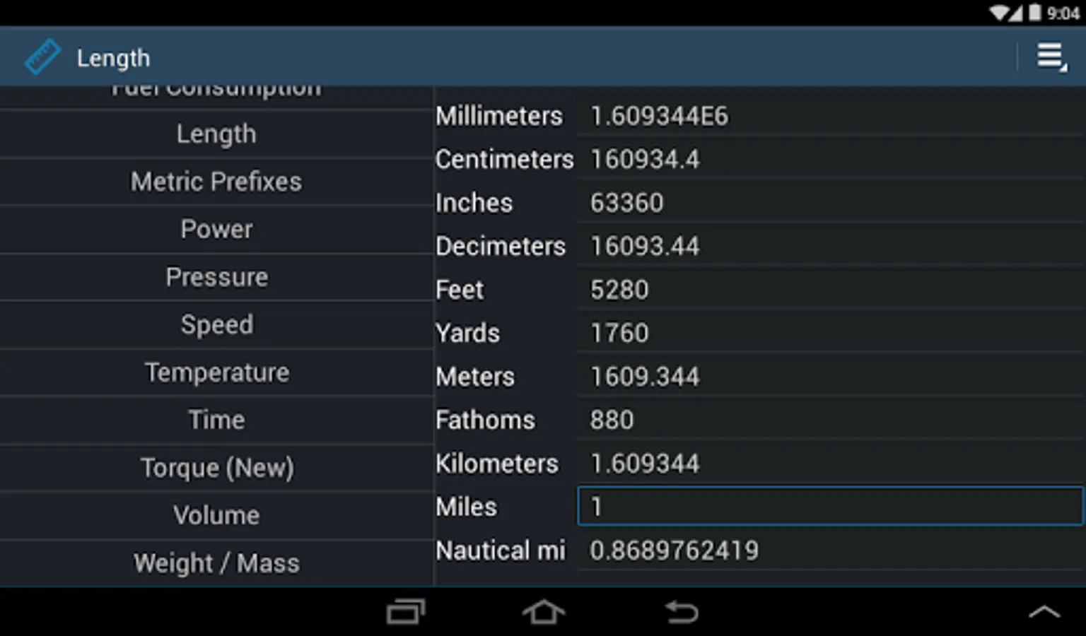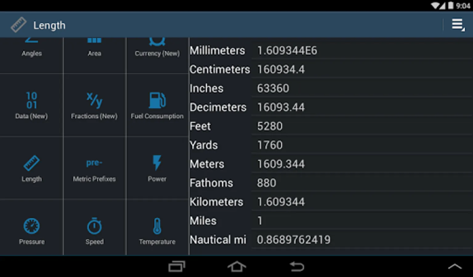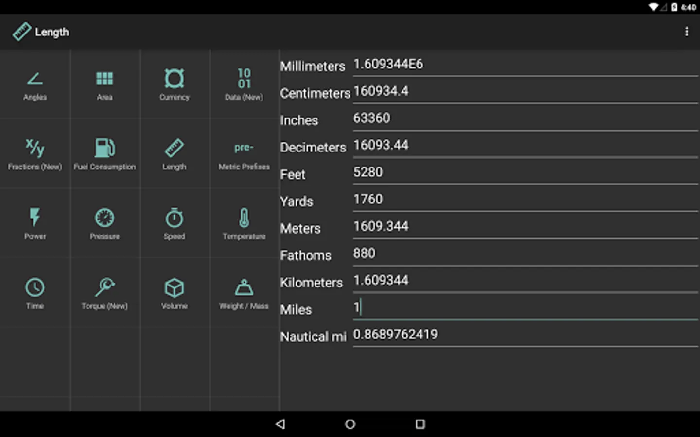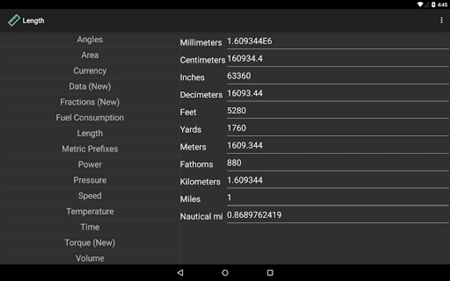 - Length (Millimeter, Centimeter, Inch, Decimeter, Feet, Yard, Fathom, Meter, Kilometer, Mile, Nautical Miles)