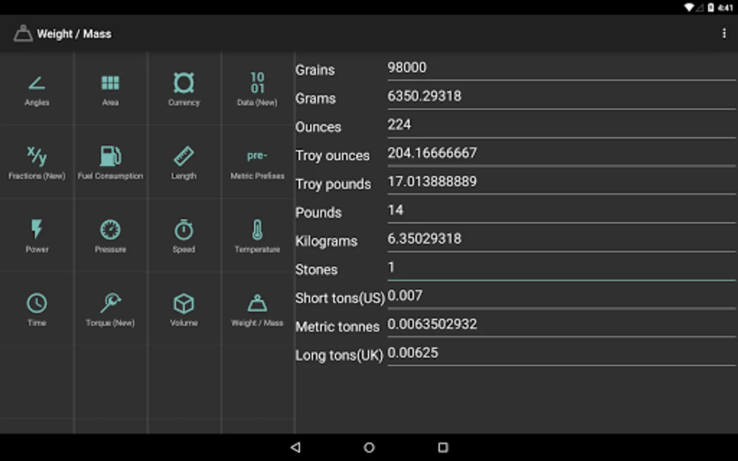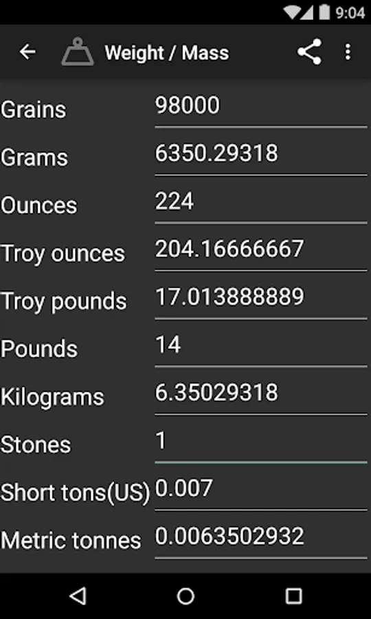 - Weight / Mass (Grain, Gram, Ounce, Troy ounce, Troy pound, Pound, Kilogram, Stone, Short Ton(US), Metric Tonne, Long Ton(UK))
