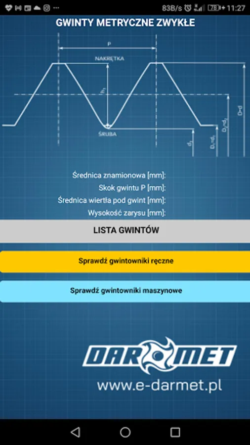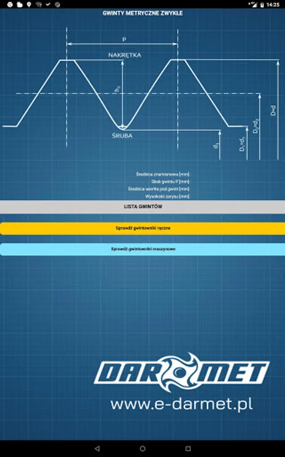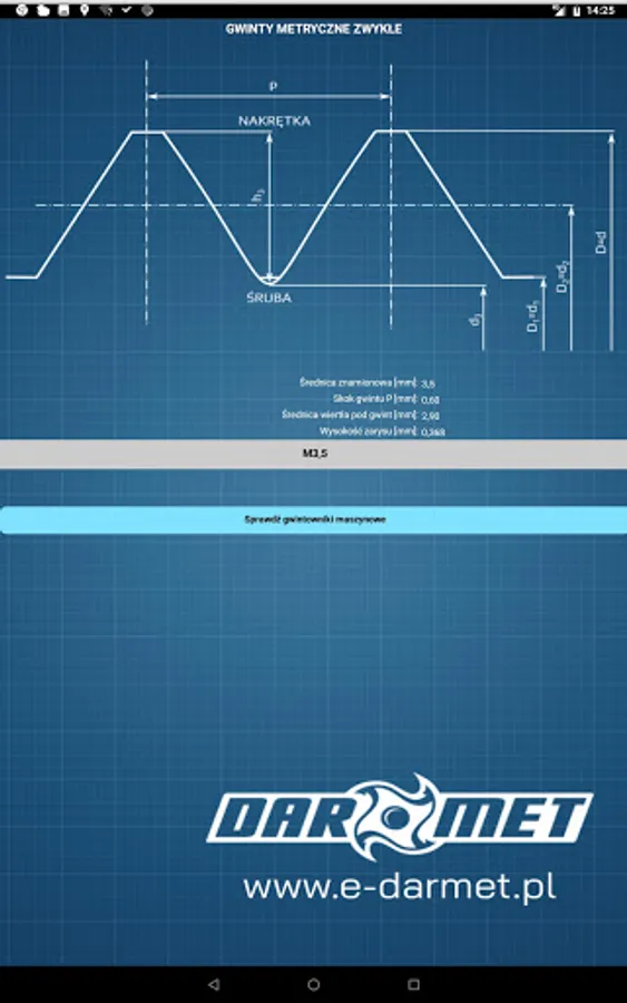 Thanks to this application, you can check the thread pitch, drill diameter for the internal thread. And other parameters of popular metric threads. The application allows you to choose a manual tap or machine tap to make a given internal thread.