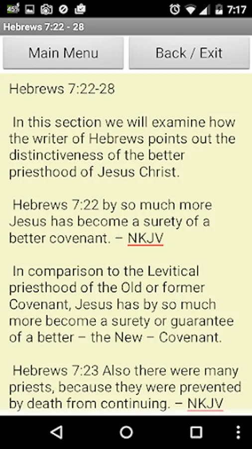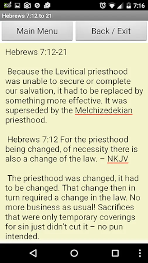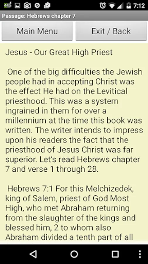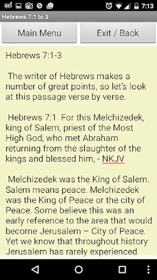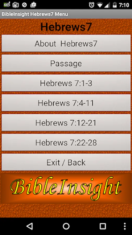 BibleInsight – Hebrews7 is an Android Application that helps people to better understand what the Bible says in the book of Hebrews Chapter 7 verses 1 through 28.