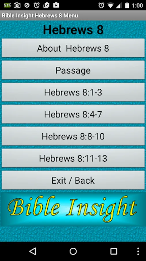 Full Description: Bible Insight Hebrews 8 is an Android Application that helps people to better understand what the Bible says in the book of Hebrews Chapter 8 verses 1 through 13.