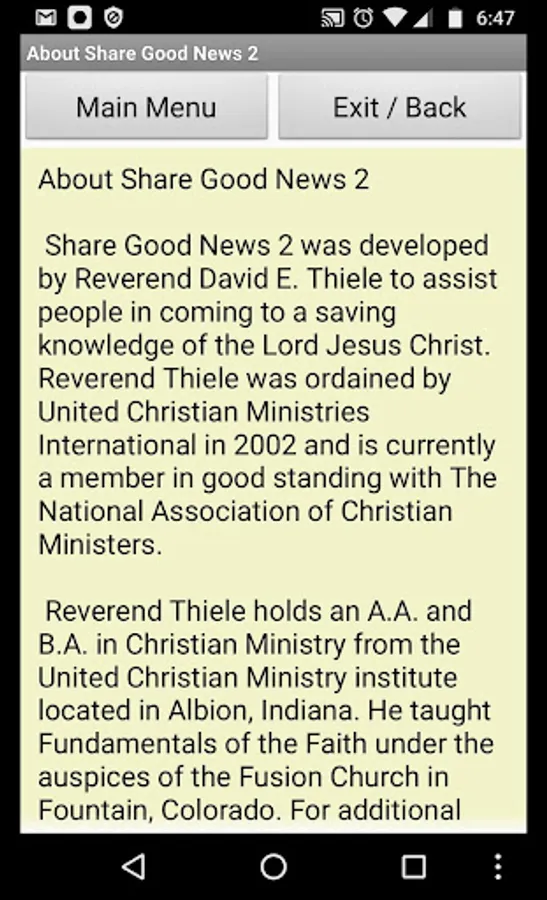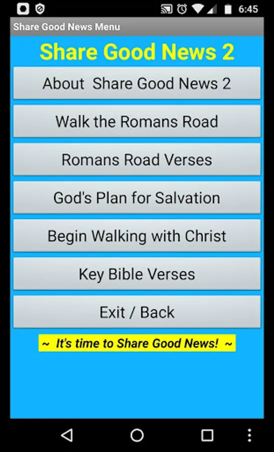 Share Good News 2 is an application designed to help share the Gospel of Jesus Christ. It may be used by individuals seeking to learn more about Jesus Christ for themselves, or it may be used by believers as an aid to share the Gospel with others. It lays out the message of the Good News as found in the Bible. The message is simple enough that a child may understand it, yet so profound that you could spend a lifetime trying to plumb it's depth. I believe you will find it to be a blessing.