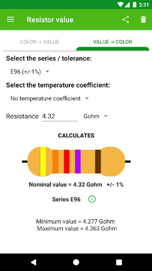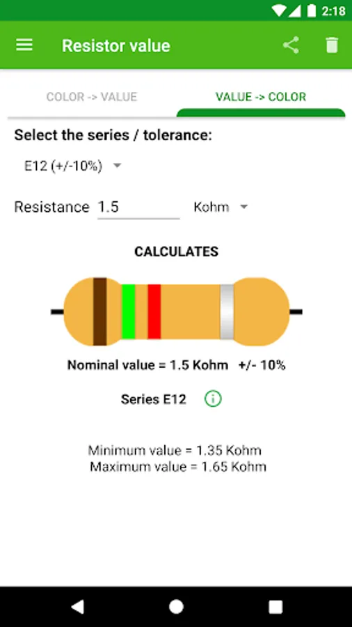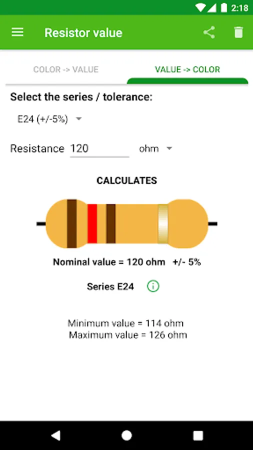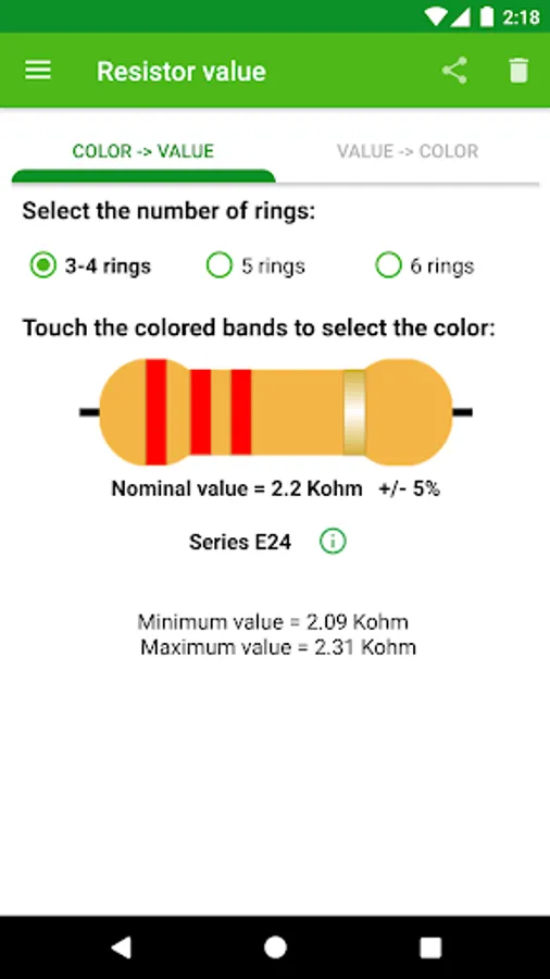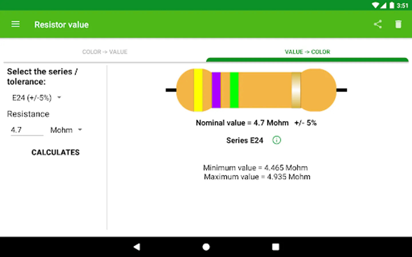 It allows you to calculate the resistance value by entering the color code of the rings, or from the value of a resistance it allows you to know the color code of the resistance.
