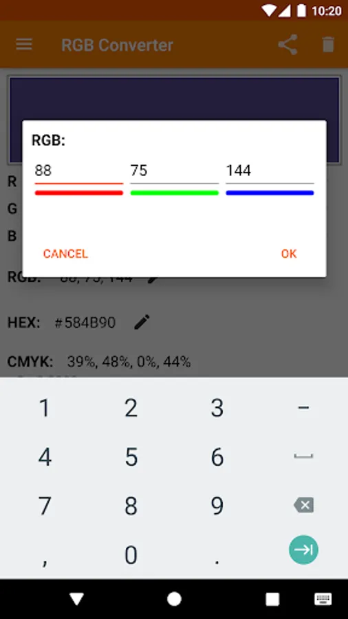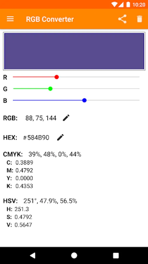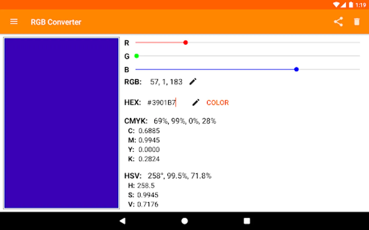 It allows you to calculate the RGB - HEX - CMYK - HSV value by mixing the three colors Red - Green - Blue.