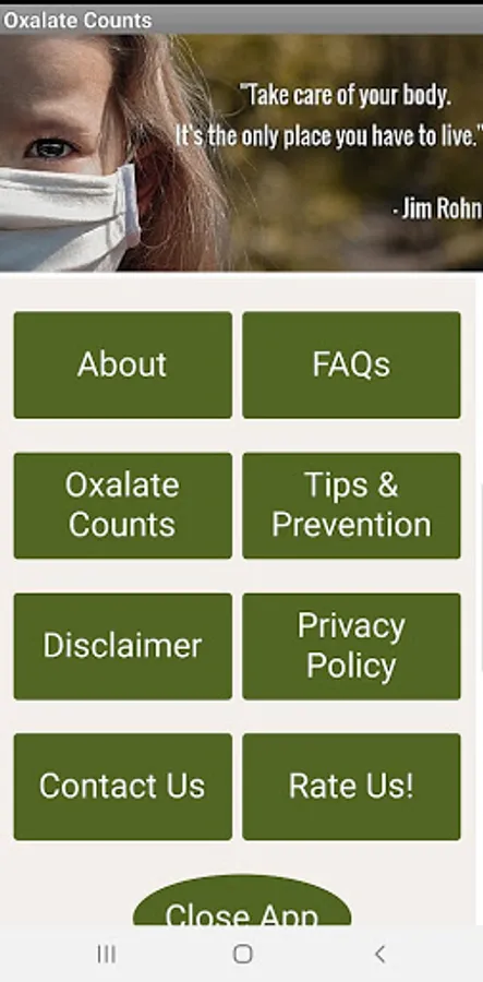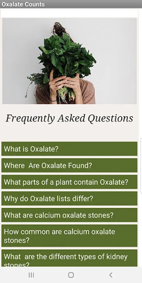 This app was created for individuals prone to recurring calcium oxalate stones ("stone formers"), have oxalate sensitivities and users of plant based diets (ketogenic, vegetarian, etc.) concerned with their oxalate intake. It may also be beneficial to individuals with other health conditions such as hyperoxaluria, oxalosis, leaky gut, IBD, crohn's disease, autism and fibromyalgia.