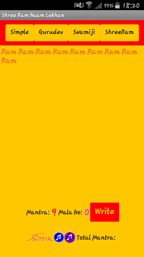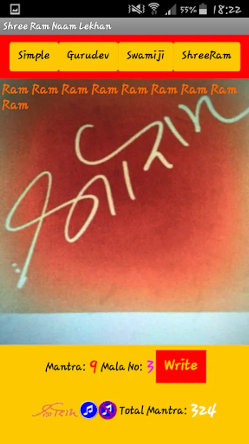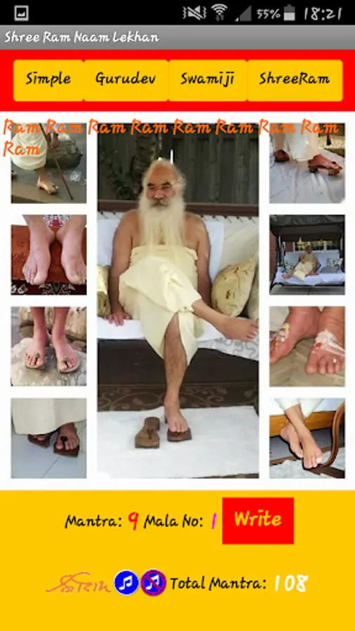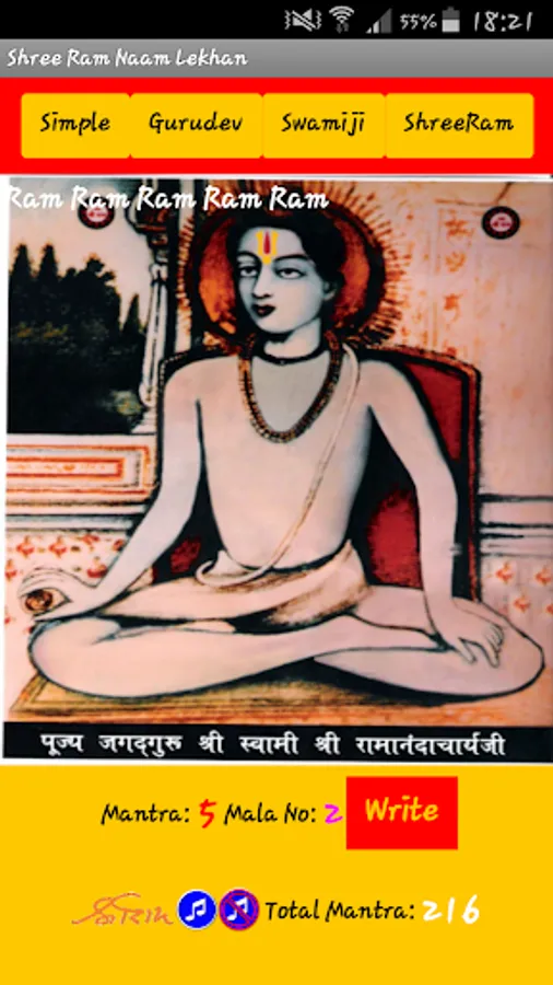 This application is made to help devotees to write and chant Shree Ram Naam on thier phone. It will help devotees to count the chants and rounds of Mala they done.