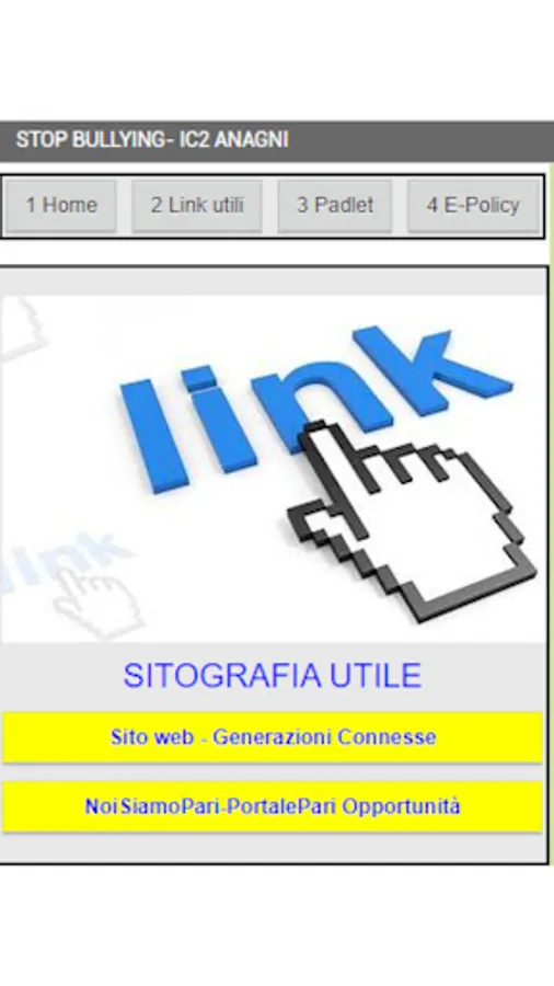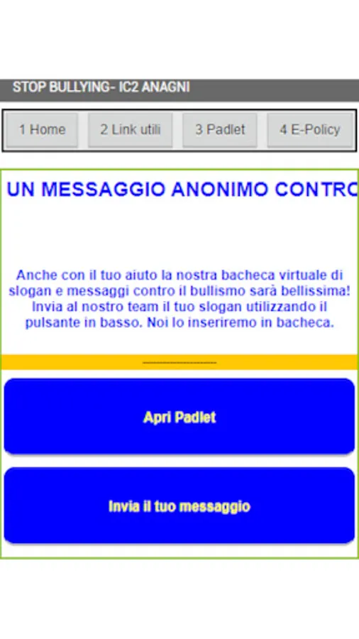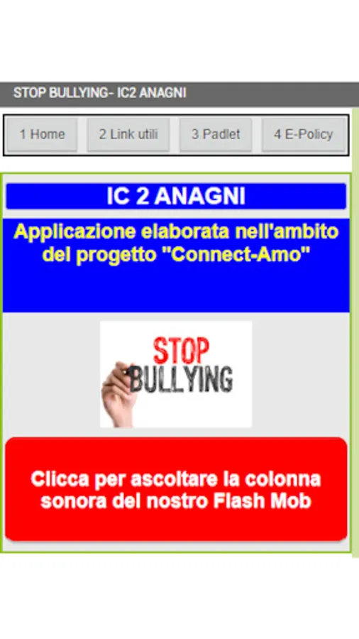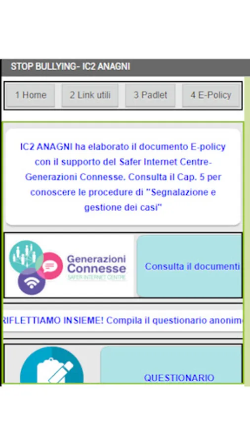 The application is configured as a tool for students and families to acquire information and provide food for thought on the issue of bullying: a selected website offers the opportunity to explore the issue further and get to know the E-Policy document drawn up by the 'IC2 Anagni with the support of the Safer Internet Centre- Generazioni Connesse; users can contribute to the creation of the dedicated Padlet entitled "My slogan against bullying", by sending their contribution to the anti-bullying team who will review it and subsequently publish it, ensuring the anonymity of the sender; it is also possible to fill in a short anonymous questionnaire, the answers to which, in aggregate form, may represent valuable food for thought for educational activities on the topic in question.