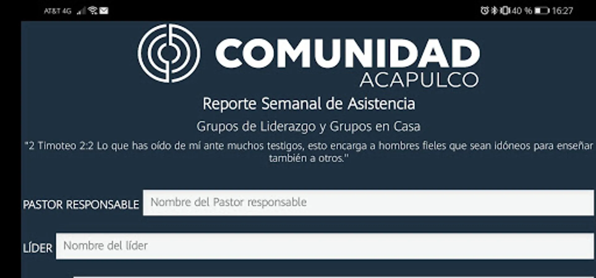 Application designed so that Pastors, leaders and assistants of Groups in Casa de Comunidad Acapulco can send their reports from the comfort of their Android cell phone.