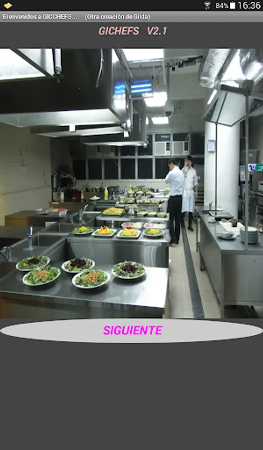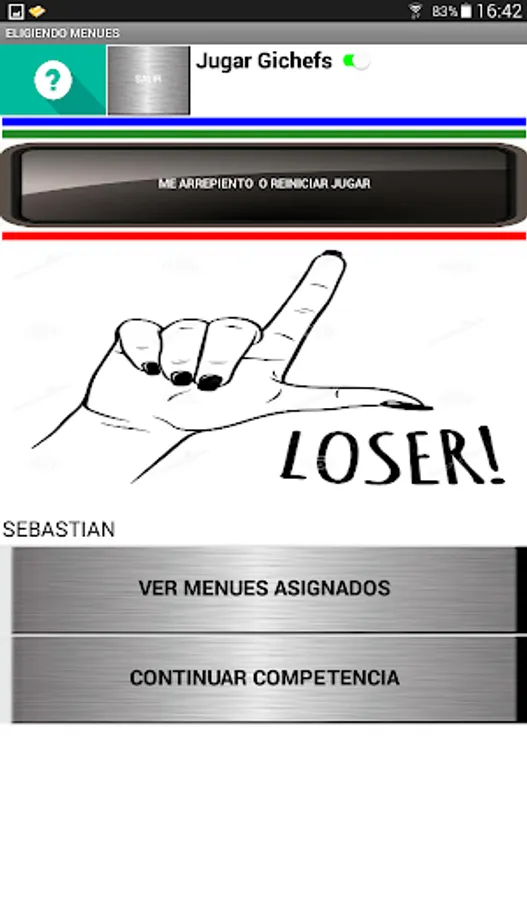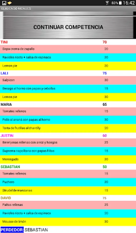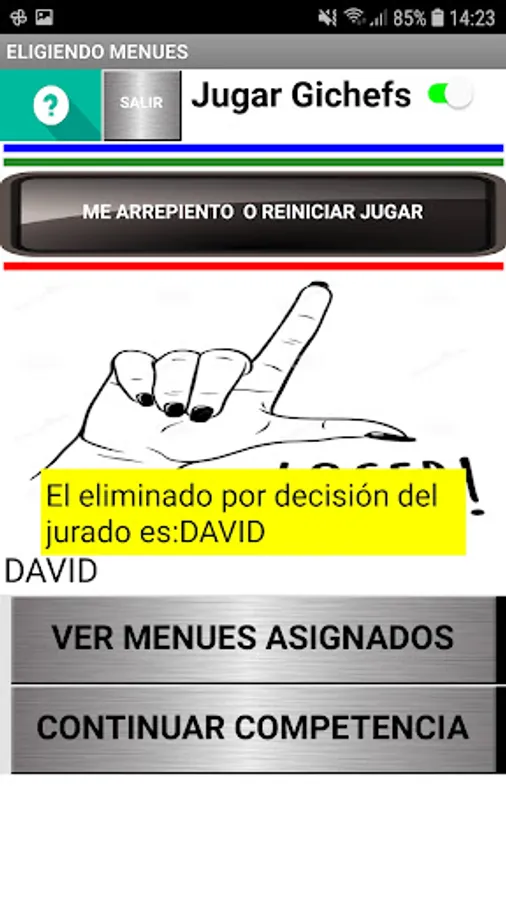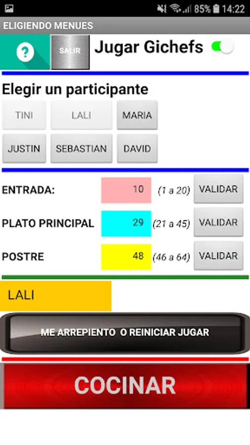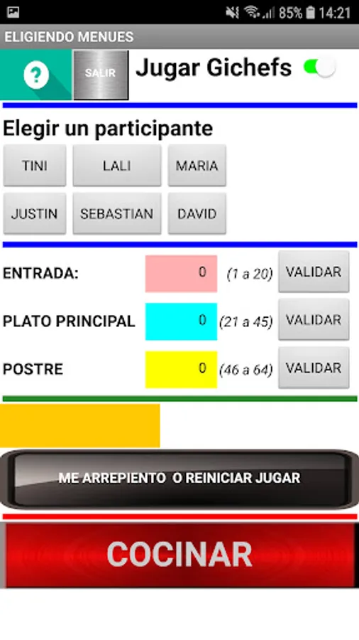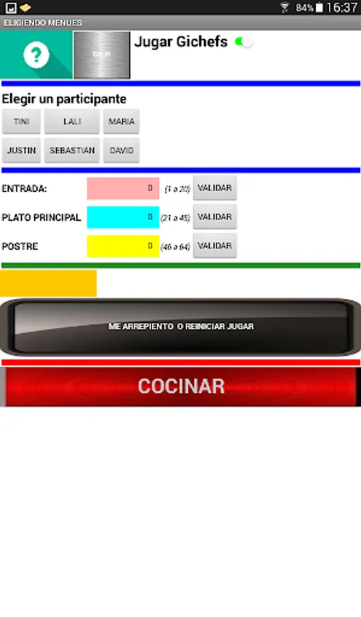 At the beginning of the game it allows to choose the names of 6 participants, being able to customize the names. After choosing the players and accepting them, the game must be turned on (Play Gichefs). By pressing the button with the player's name, you must choose the starter, main and dessert dishes, using numbers whose range is specified in each case, do not forget to validate in each case. Do the same with the other players and then press COOK. The player with the lowest score in the elaboration is eliminated, continuing the competition with the rest until only one winner is found. The App has a regret and exit button.