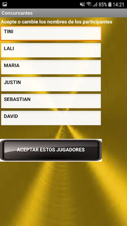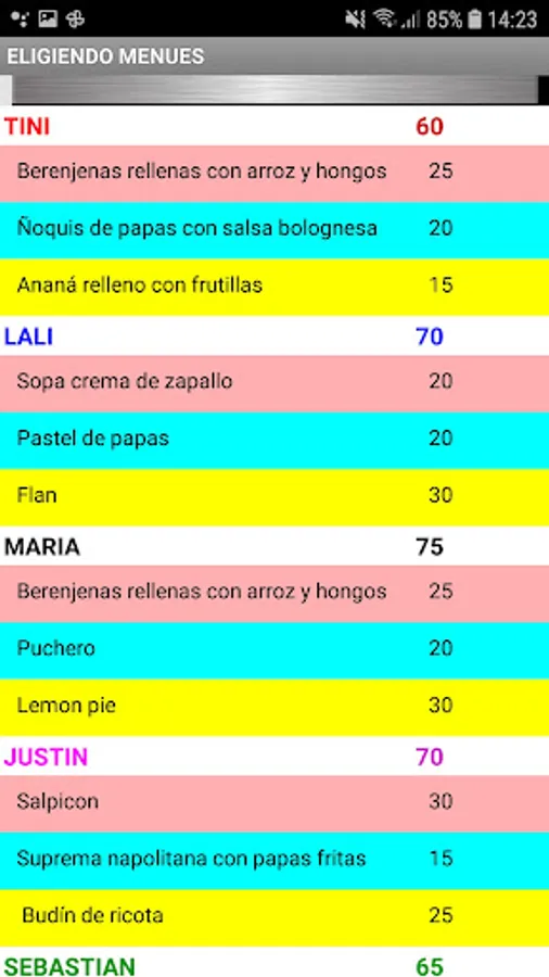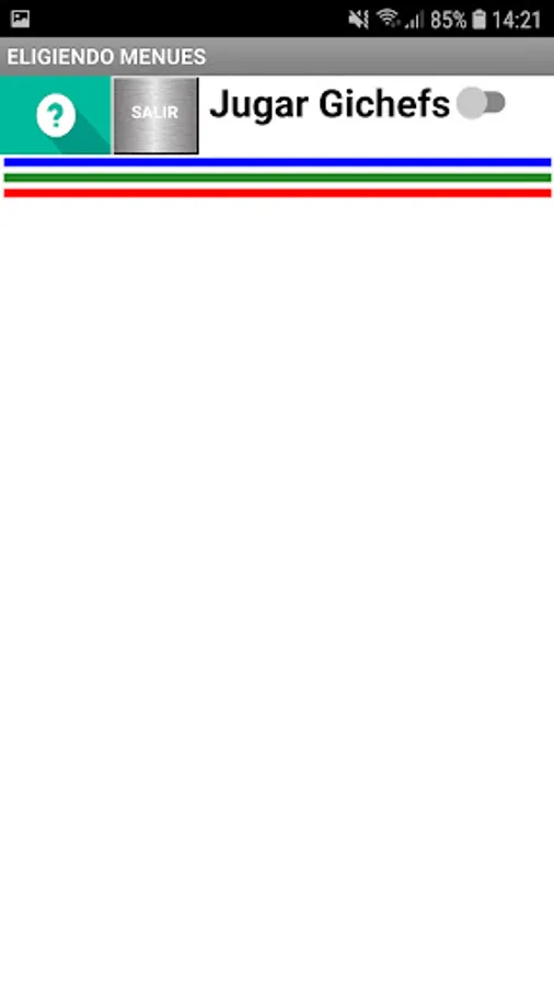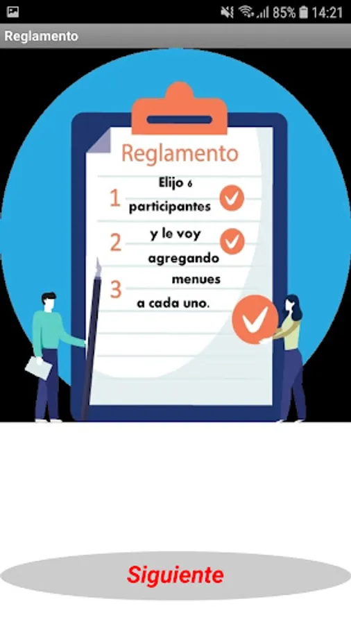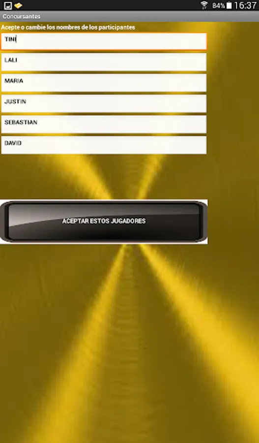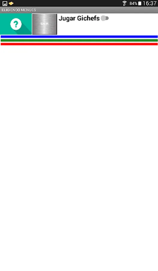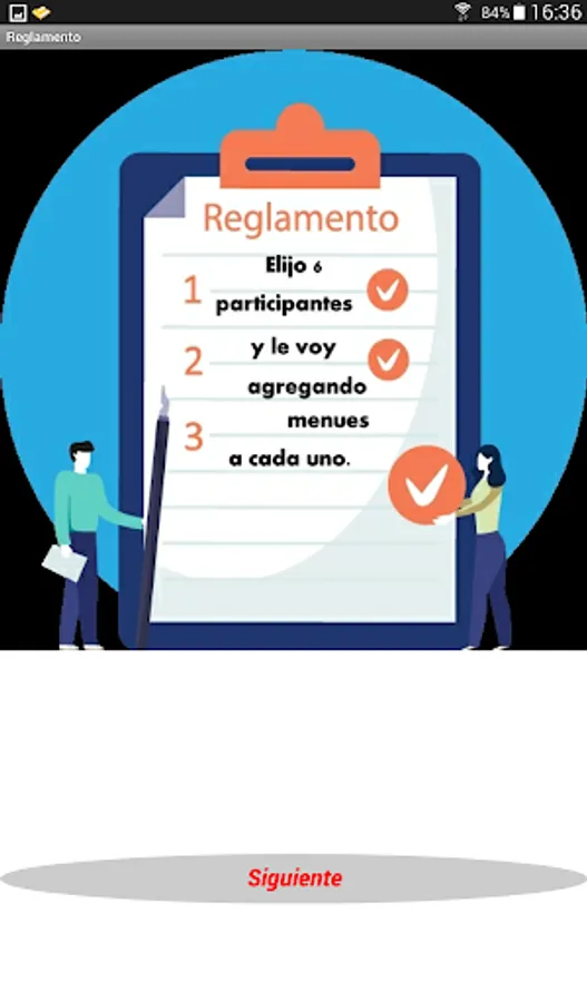 At the beginning of the game it allows to choose the names of 6 participants, being able to customize the names. After choosing the players and accepting them, the game must be turned on (Play Gichefs). By pressing the button with the player's name, you must choose the starter, main and dessert dishes, using numbers whose range is specified in each case, do not forget to validate in each case. Do the same with the other players and then press COOK. The player with the lowest score in the elaboration is eliminated, continuing the competition with the rest until only one winner is found. The App has a regret and exit button.