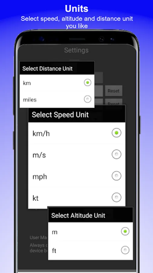 ✓ Unit selection resp. conversion (km/h, m/s, miles, m, feet, mph, kt)