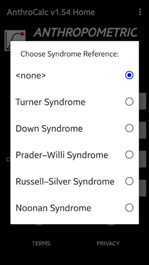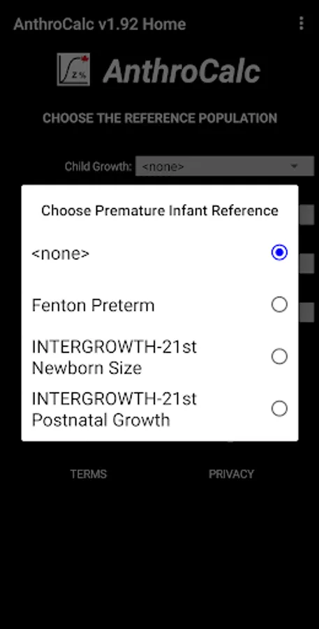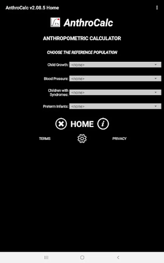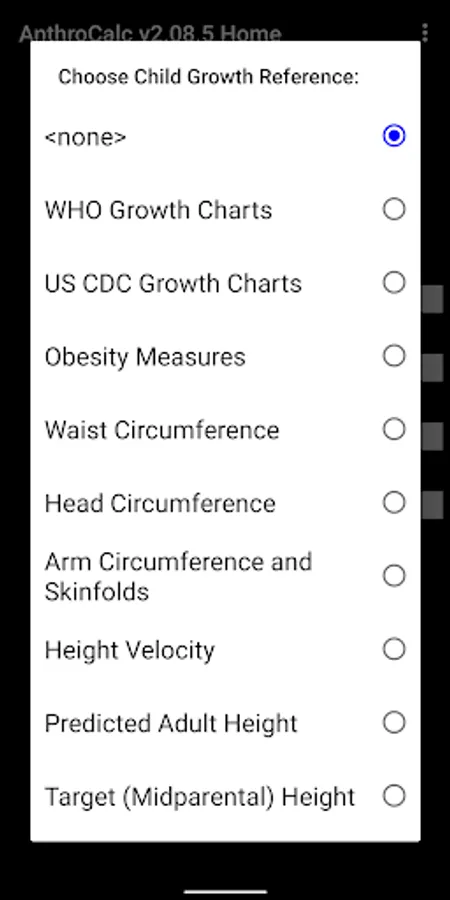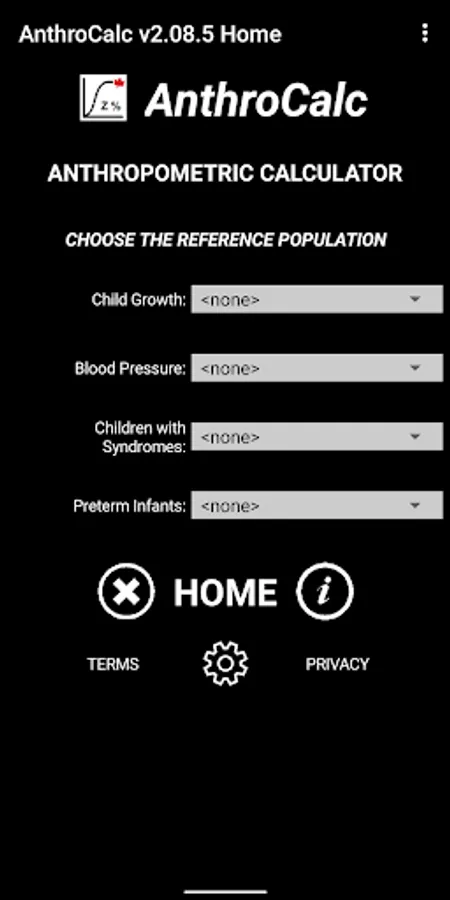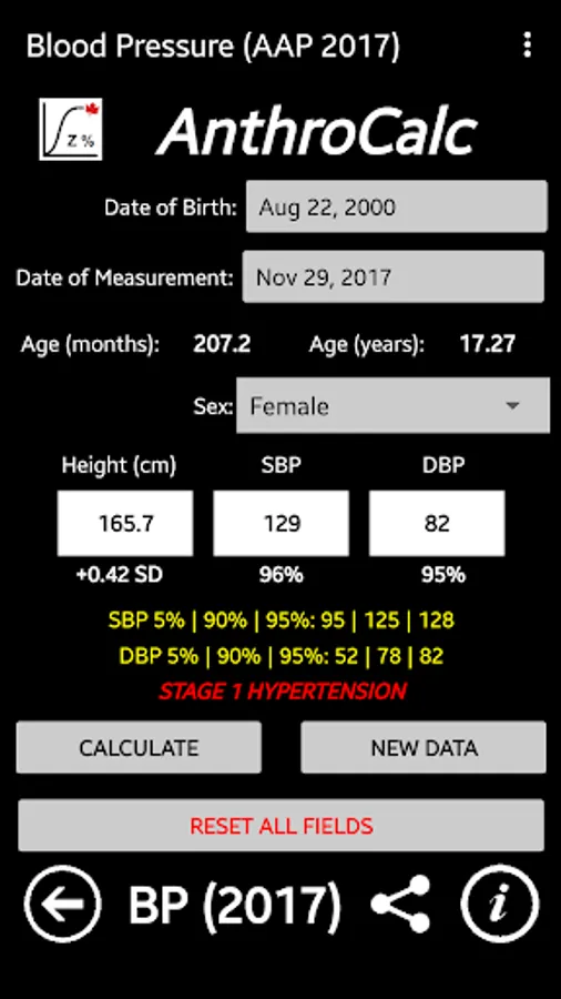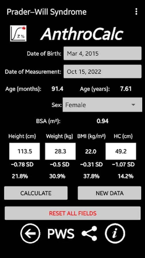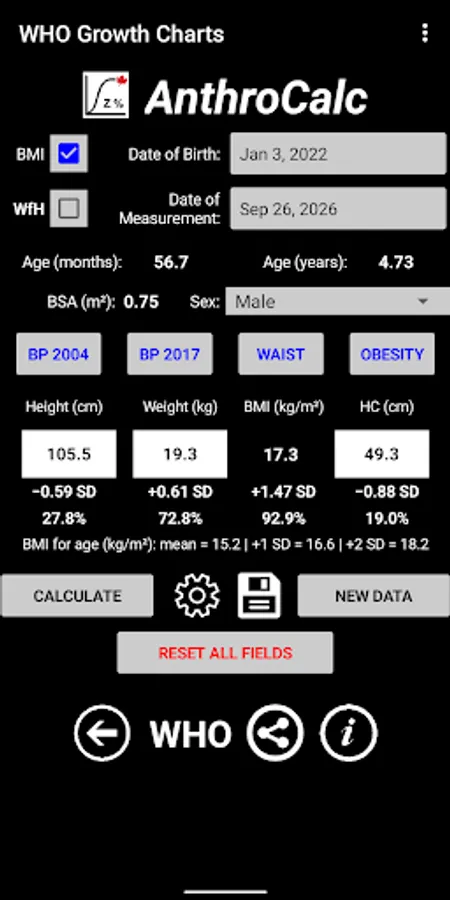 The AnthroCalc app calculates percentiles and Z-scores for length/height, weight, weight-for-length/height, body-mass index, and head circumference for typically growing children (using WHO or CDC references); for children with a number of syndromes (Turner, Down, Prader–Willi, Russell–Silver and Noonan); and for preterm infants (using Fenton, INTERGROWTH-21st, or Olsen references). The app also performs specialized calculations of blood pressure (using NIH 2004 or AAP 2017 references), extended obesity measures, waist circumference, arm circumference, triceps and subscapular skinfolds, target (midparental) height, predicted adult height, and height velocity for healthy children. Citations are provided for each reference range used for the calculations. Patient-specific data derived from WHO and CDC growth charts can be stored on device for later retrieval.
