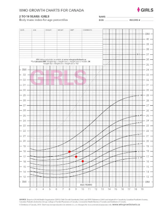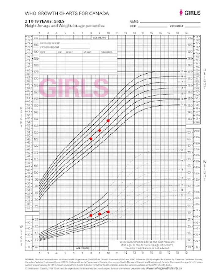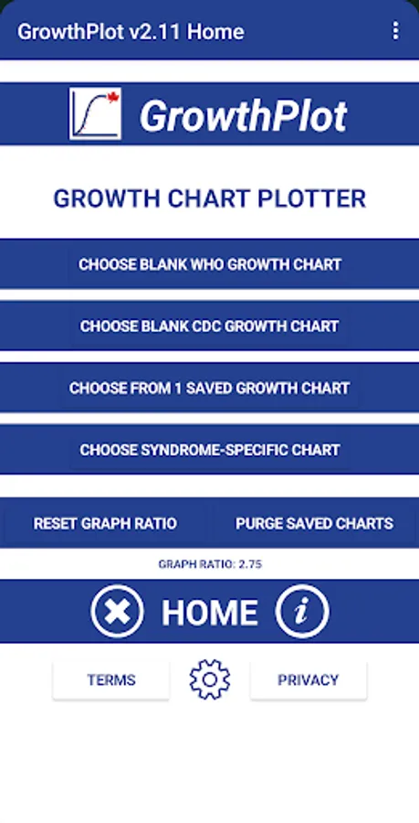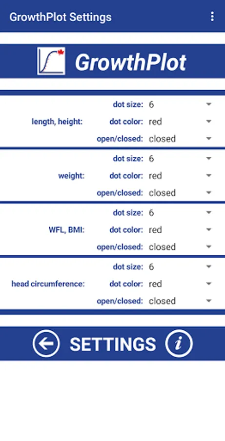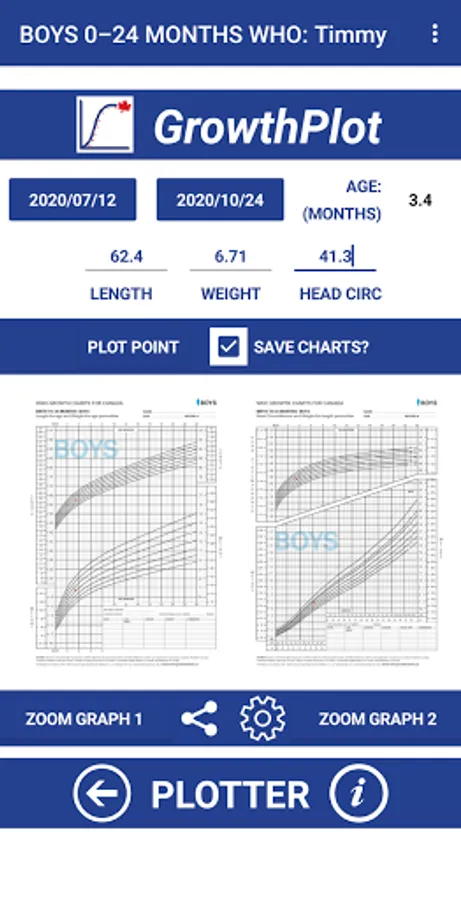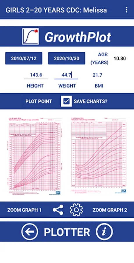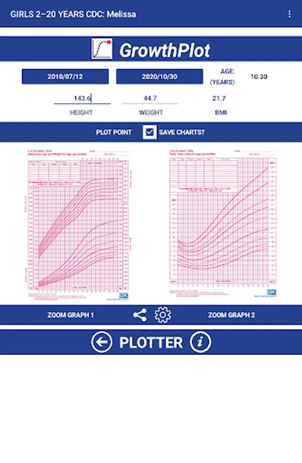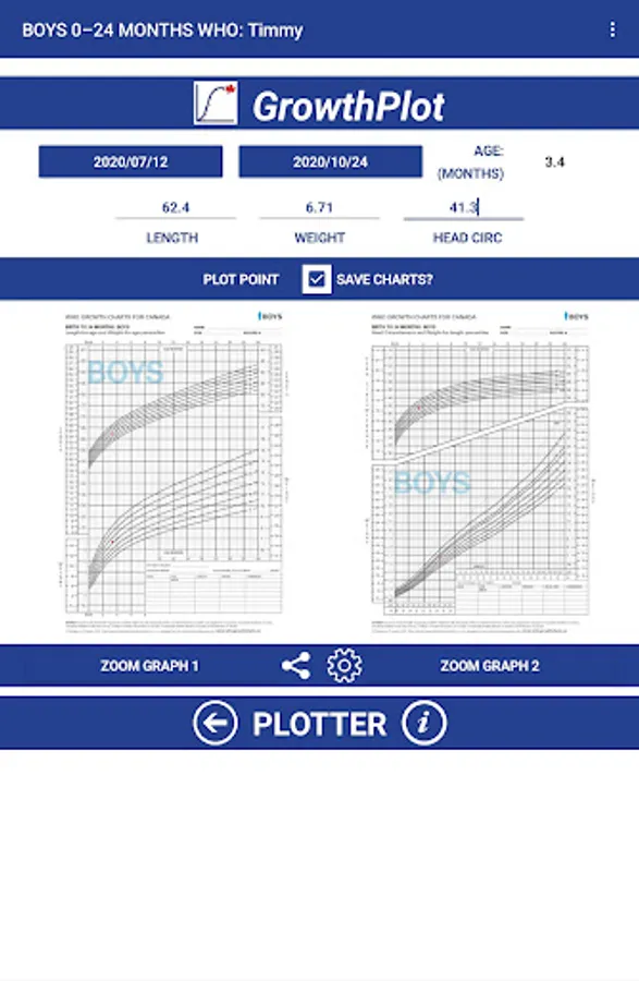 The GrowthPlot app plots length (cm), weight (kg), head circumference (cm) and weight-for-length for children (0–24 months of age for WHO, 0–36 months for CDC); and it plots height (cm), weight (kg) and body-mass index (kg/m²) for children (2–19 years of age for WHO, 2–20 years for CDC). Plots for WHO are made using the WHO Growth Charts for Canada, March 2014 revision; these data and graphs are available at <whogrowthcharts.ca>. Plots for CDC are made using the 2000 CDC Growth Charts; these data are available at <cdc.gov/growthcharts>. Please note that the CDC now recommends the use of the WHO growth standards for infants 0–2 years of age. You can save growth charts generated by this app to your device for later use. You can also share growth charts as PNG image files via e-mail or text, suitable for use in publications or presentations.