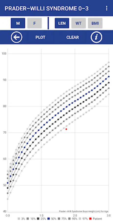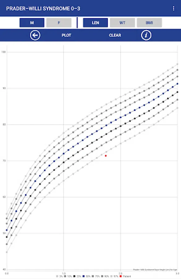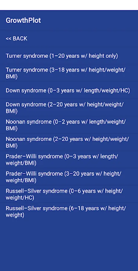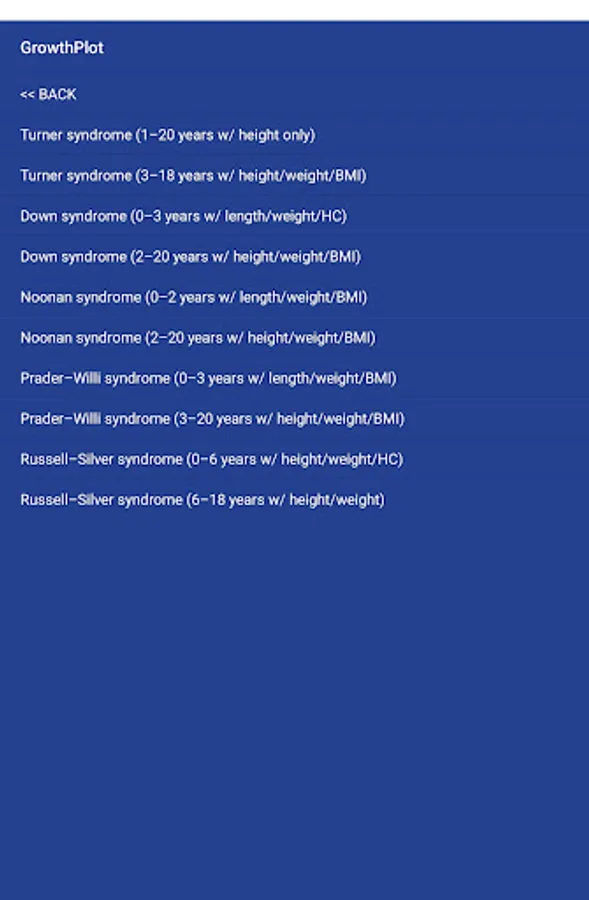 The GrowthPlot apps also plots selected growth parameters (such as height, weight, body-mass index and head circumference) for children with a number of syndromes (Turner, Down, Noonan, Prader–Willi and Russell–Silver). Citations are provided for each reference range used for these calculations.