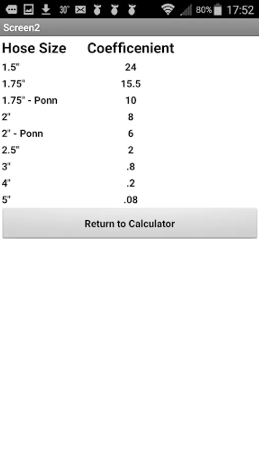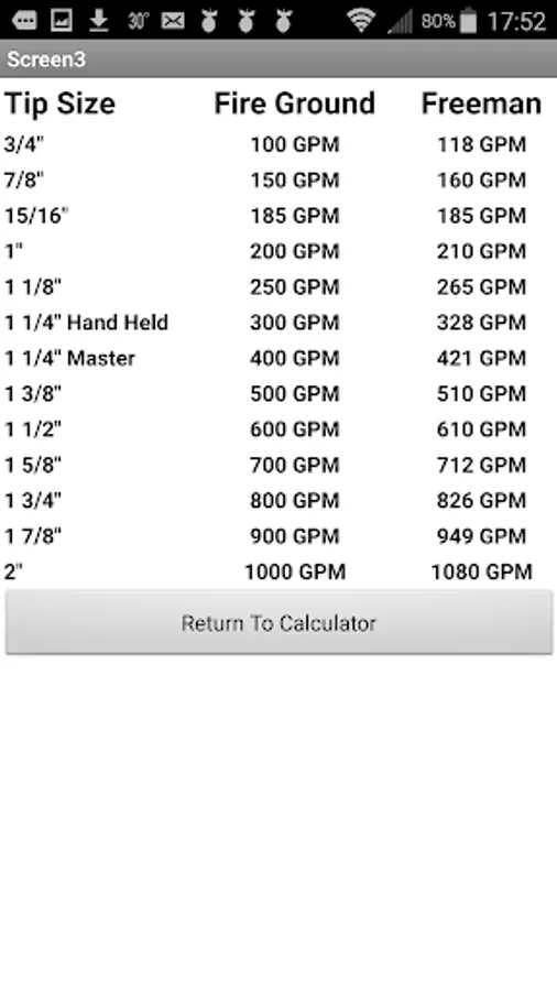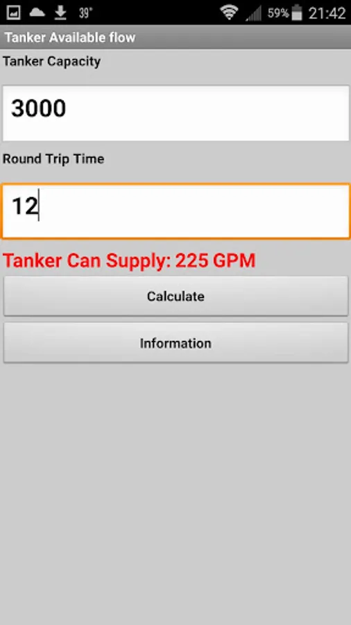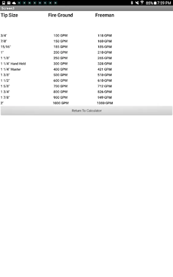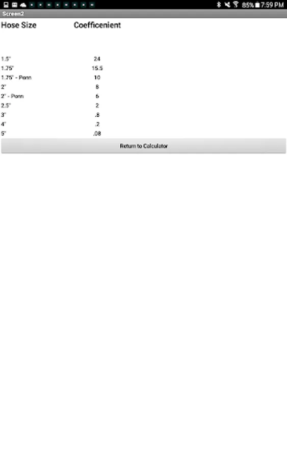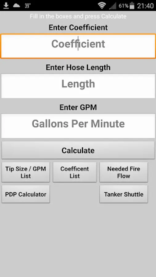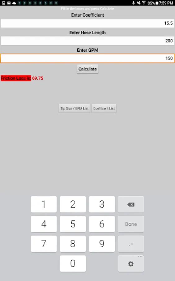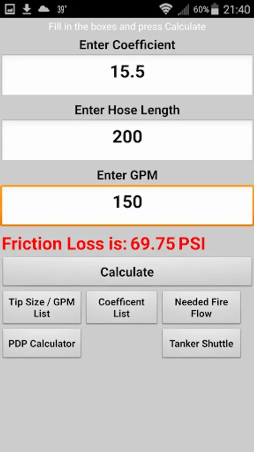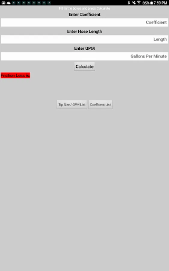 Friction Loss Calculator, Needed Fire Flow, Tanker Shuttle / Rural Water and Pump Discharge Pressure calculators. The user can enter any numerical value into each of the text boxes to find the amount of friction loss in a given length of hose. The app allows for any numbers to be used to accommodate newer hoses and coefficients. I have supplied two reference pages with the app for common hose coefficients along with common tip sizes and gallons per minute for each tip size.