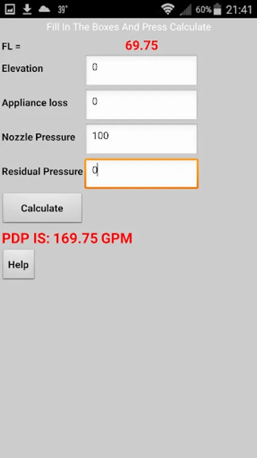 New update has a pump discharge calculator that gives PDP with Elevation (enter in feet), Nozzle Pressure, Appliance Pressure and Residual Pressure. Enter 0 for fields you do not need.