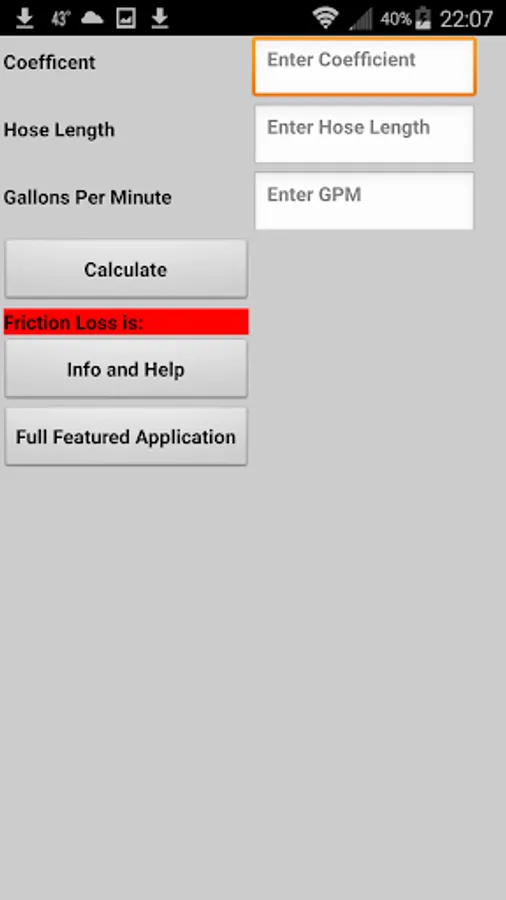 This is the lite version of our fire department friction loss calculator. It allows the user to find friction loss for hose lines of any length with and gallon per minute flow and any coefficient. It uses the formula FL=C*GPM²*L.