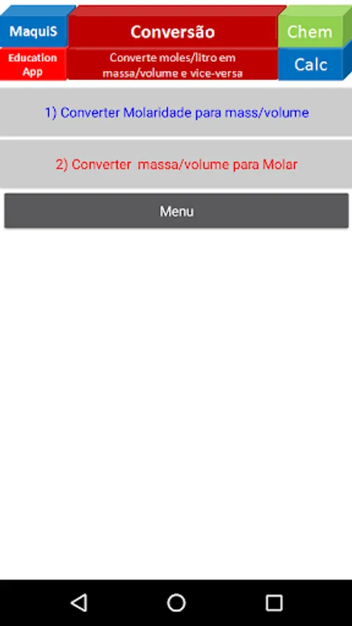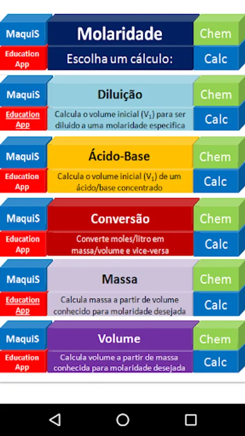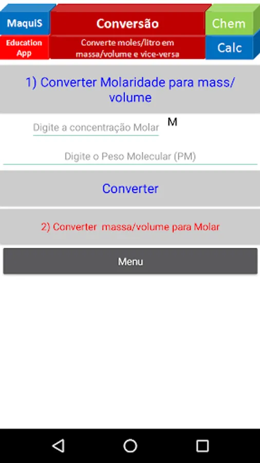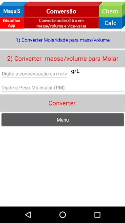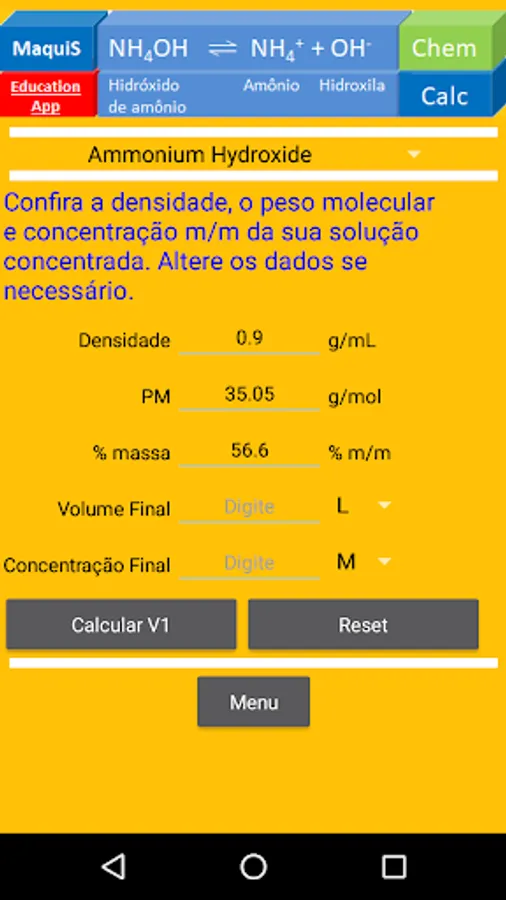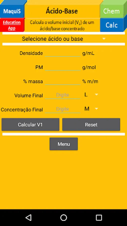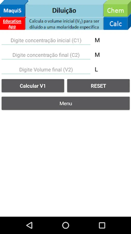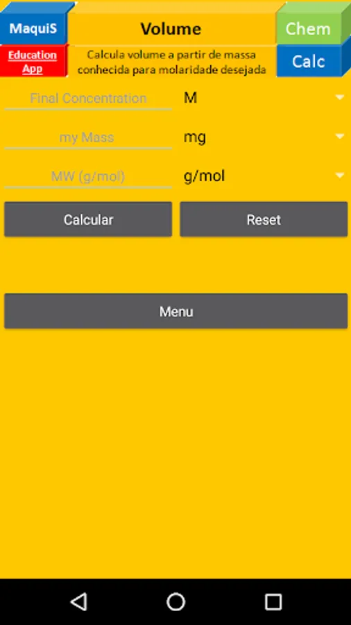 O App é capaz de achar volume a partir de uma massa pesada e a concentração desejada em qualquer unidade: molar, micromolar, milimolar, g/L, mg/L, mg/mL.