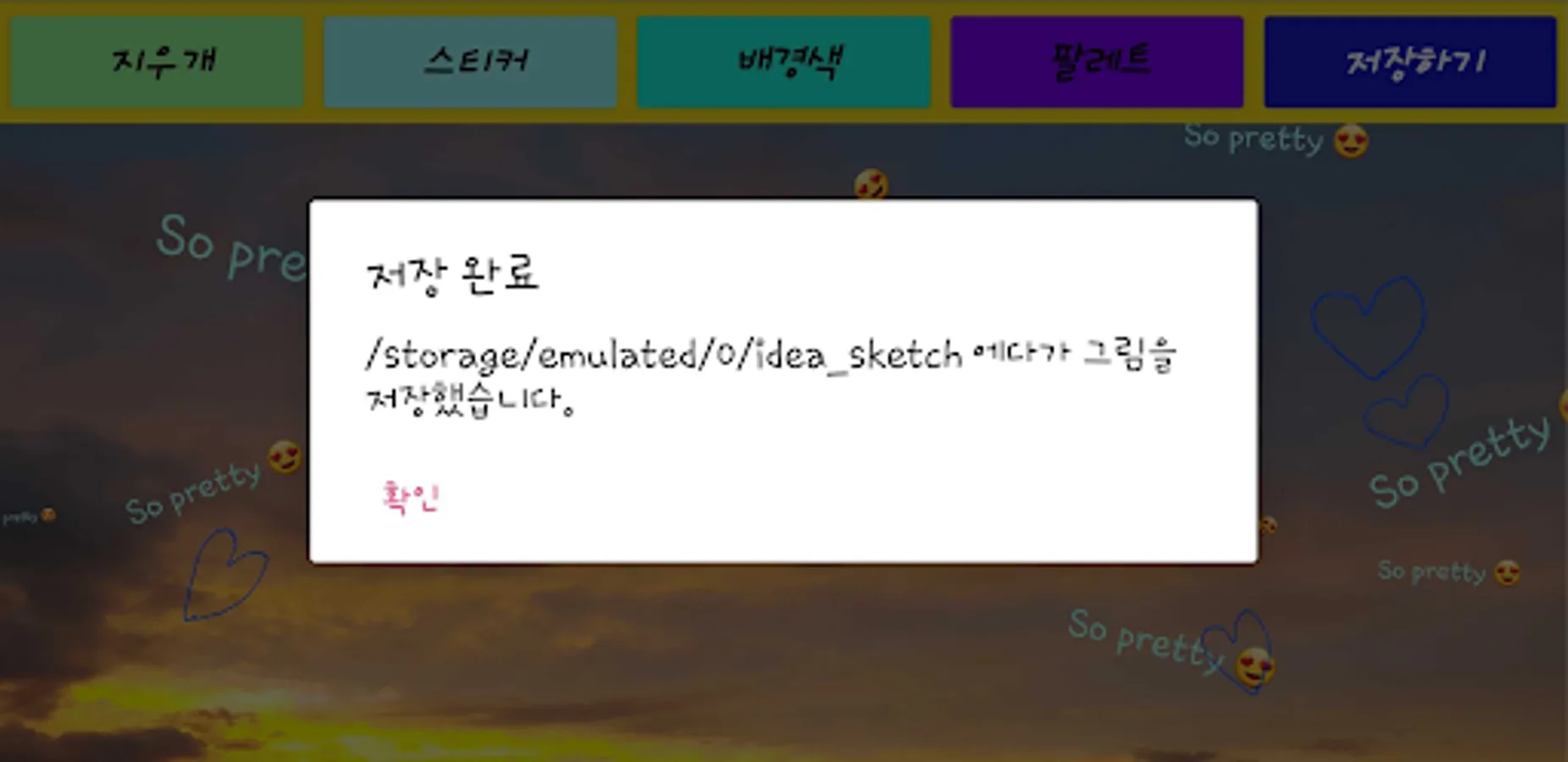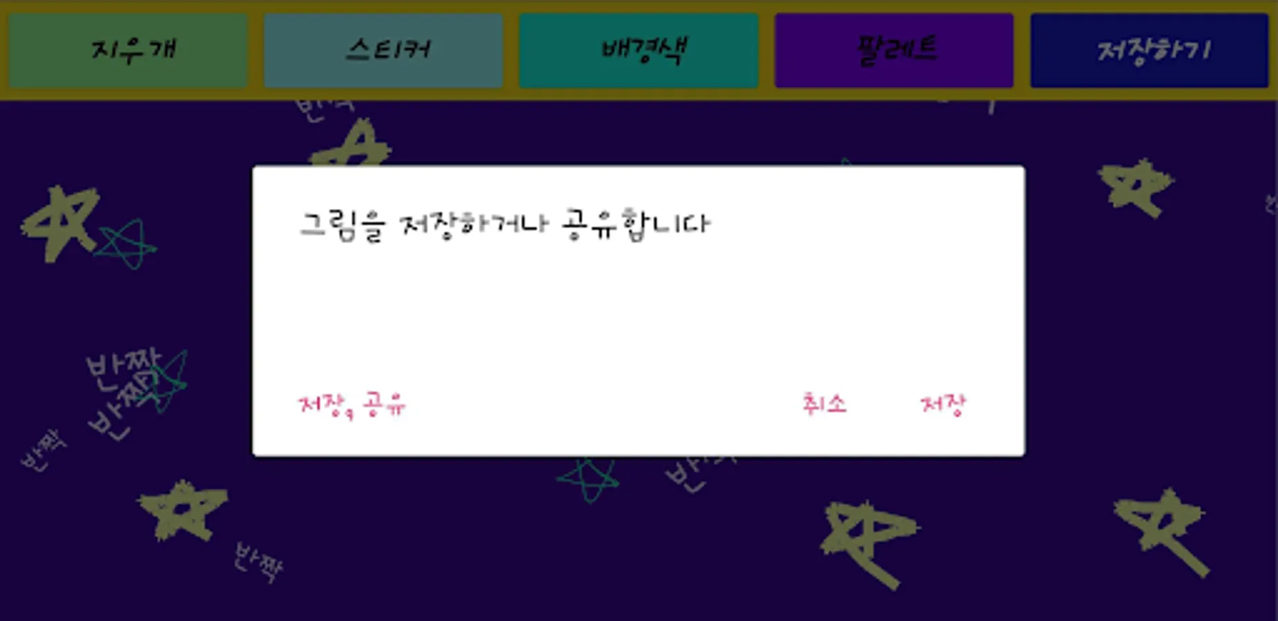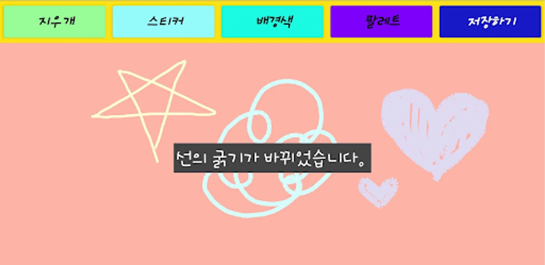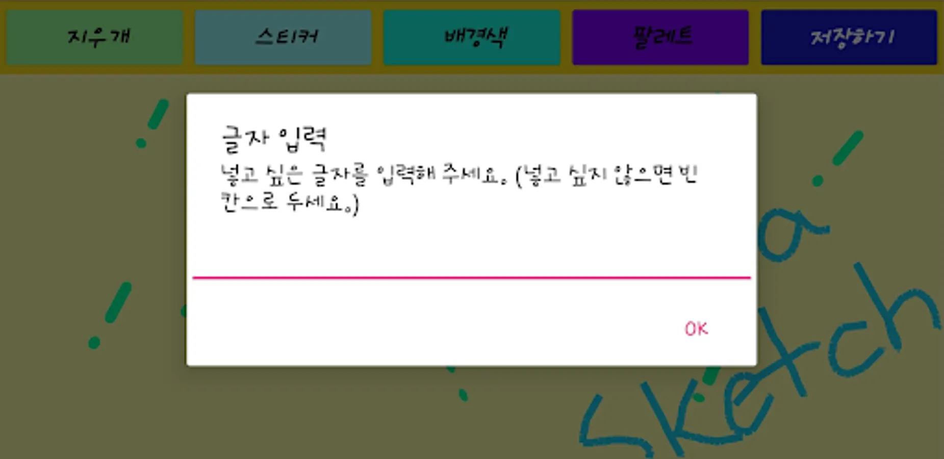 Idea Sketch has a total of 5 buttons. The eraser button can erase the background and graffiti separately. The sticker button allows you to insert stickers of various shapes as much as you want, and if you select the text input item, you can also insert the desired text. The background color button and the palette button allow you to easily and simply select the desired color using the spectrum. The Save button allows you to save and share, and shake your smartphone to take a picture using the camera.