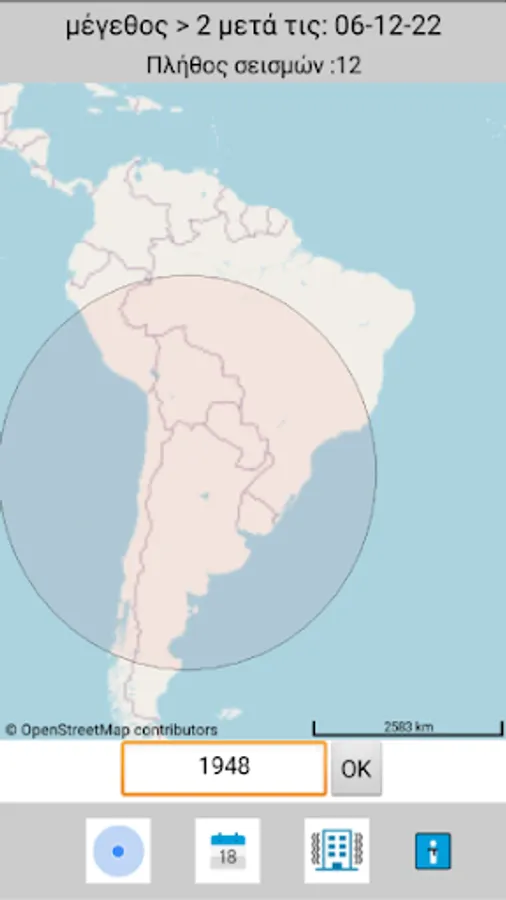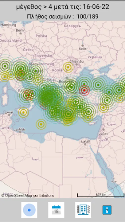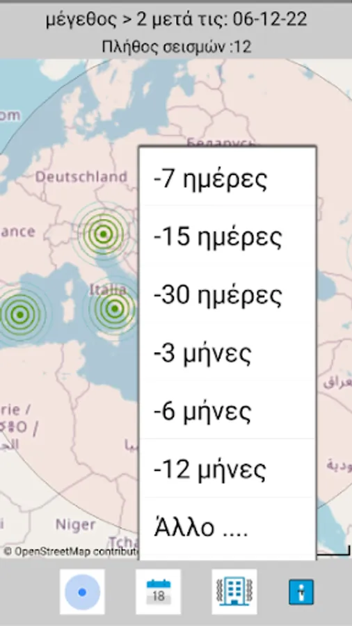 You also choose whether earthquakes occur worldwide or in a 2500km radius circle. The center of the circle is initially in the middle of the Aegean, so our neighboring earthquakes are shown. Touch and hold anywhere else on the map to change the center of the focus circle.