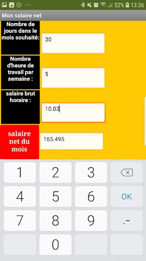 You must enter the number of hours per week and the hourly amount this application calculates the net salary deducted from your data.