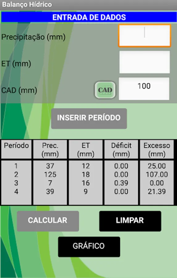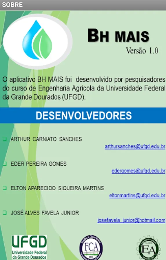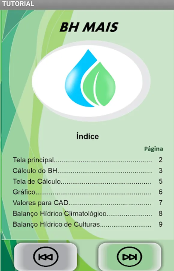 The BH MAIS app was developed to assist professionals and students in the area in the calculation of water balance. This application has the advantage of very intuitive screens, thus facilitating the input of input variables and also the interpretation of output data (results), which are displayed in the form of tables and graphs. With BH MAIS it is possible to calculate Crops Water Balance and Climatological Water Balance.