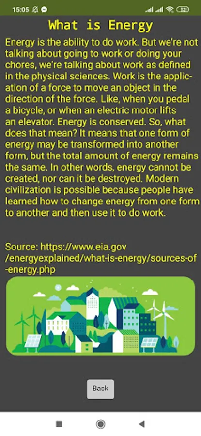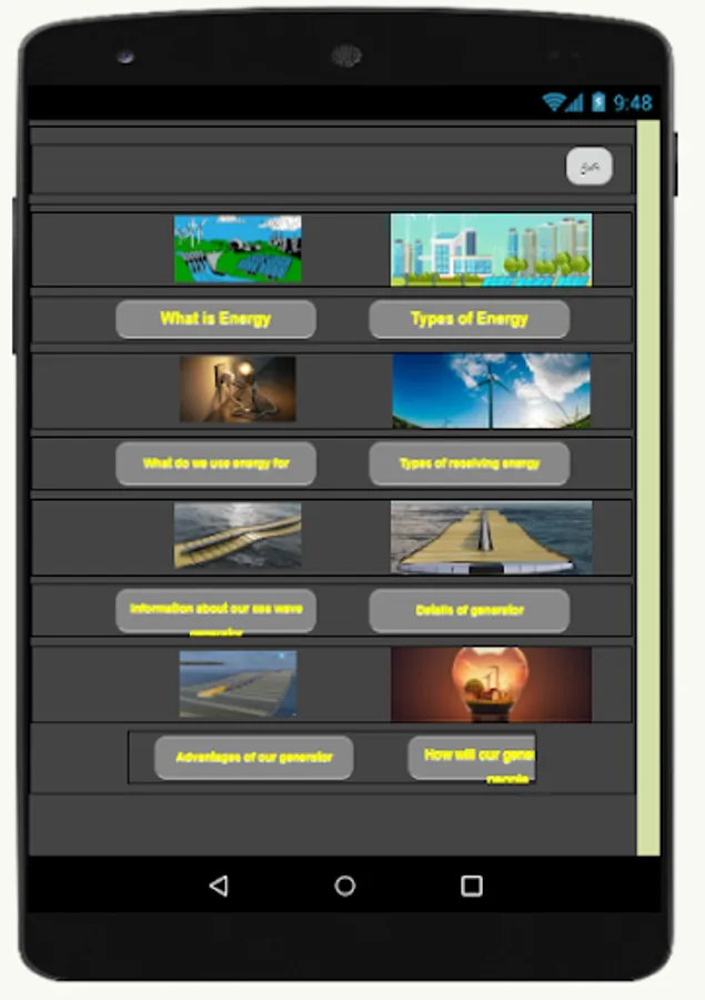 In this application you'll be able to know more about energy and our sea wave generator. In this app you'll learn about energy, types of energy, receiving energy, what do we use energy for and more about our generator. This app will be useful for everyone who is interested in learning about energy.