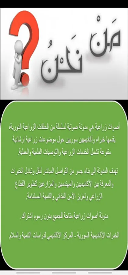 Agricultural Voices is a podcast of a series of periodic agricultural episodes, presented by Syrian experts and academics, on various agricultural extension topics, including agricultural services and scientific and practical recommendations. The blog aims to build a bridge of direct communication for the transfer and exchange of expertise and knowledge between academics, engineers and farmers to develop the agricultural sector, promote food security and sustainable development.