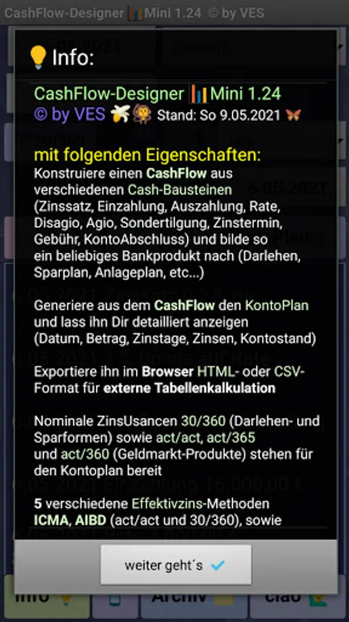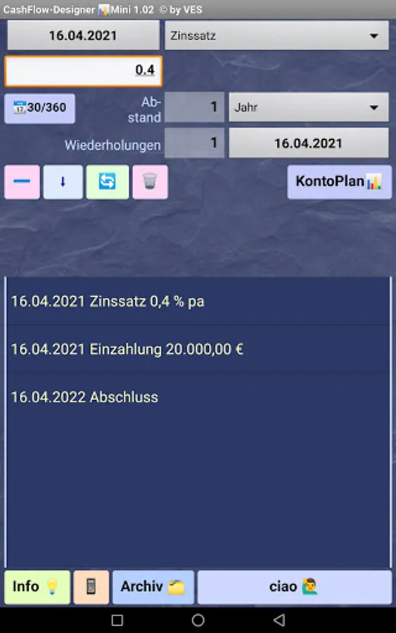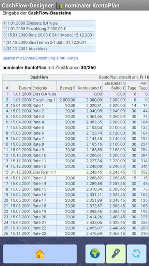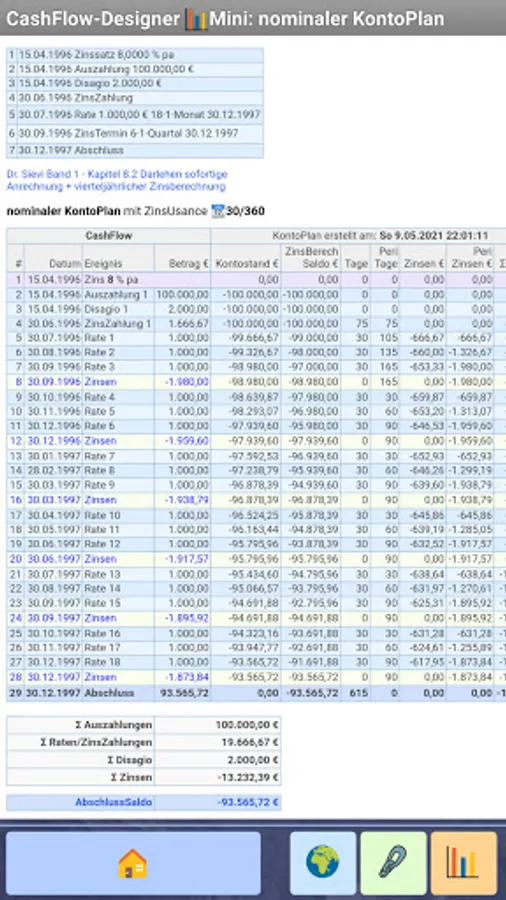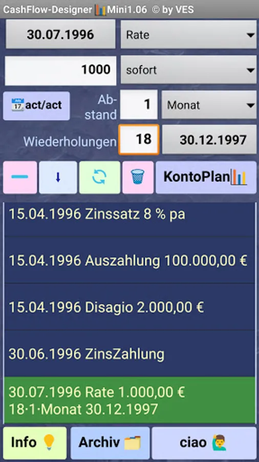 Create / define a CashFlow from available πΆ cash components (deposit, payout, installment, discount, special repayment, interest dates, etc.), for example to create a loan or savings plan from a bank and display the nominal account plan from the generated cash flow according to various interest rate scenarios in a web browser ...