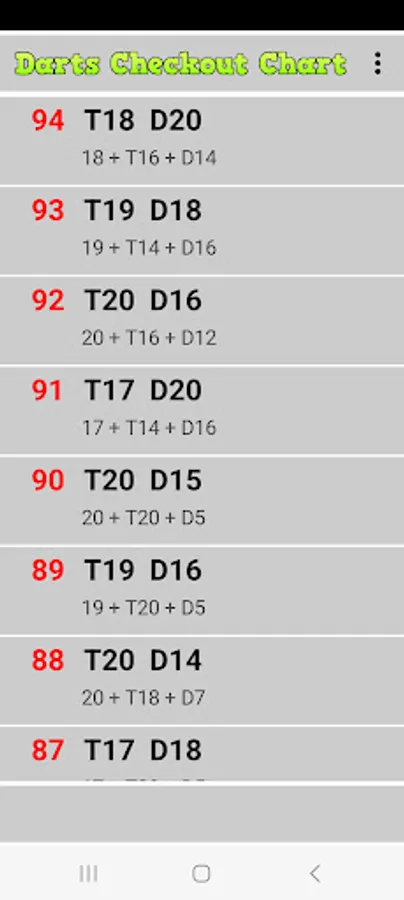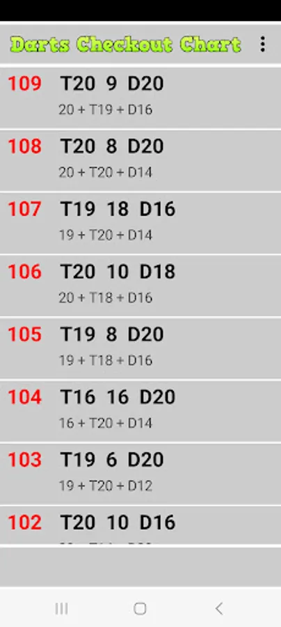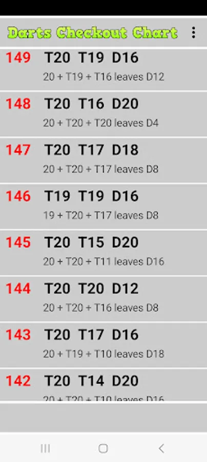 The App is a simple goout table and can help the player choose an effective way to double out the game. Furthermore, subsequent rolls to the first are suggested in the case of a wrong triple.