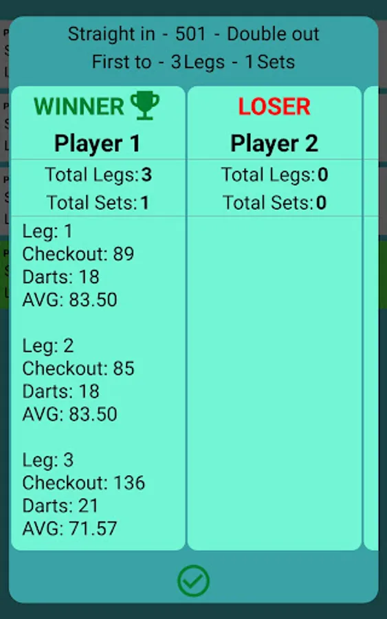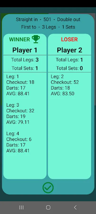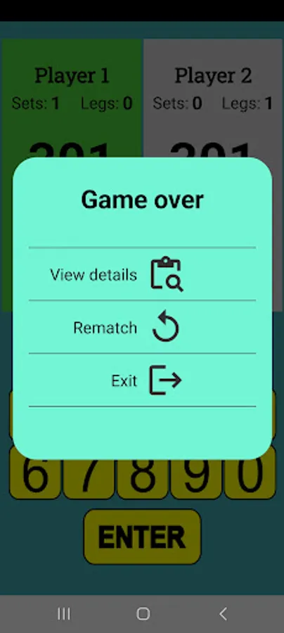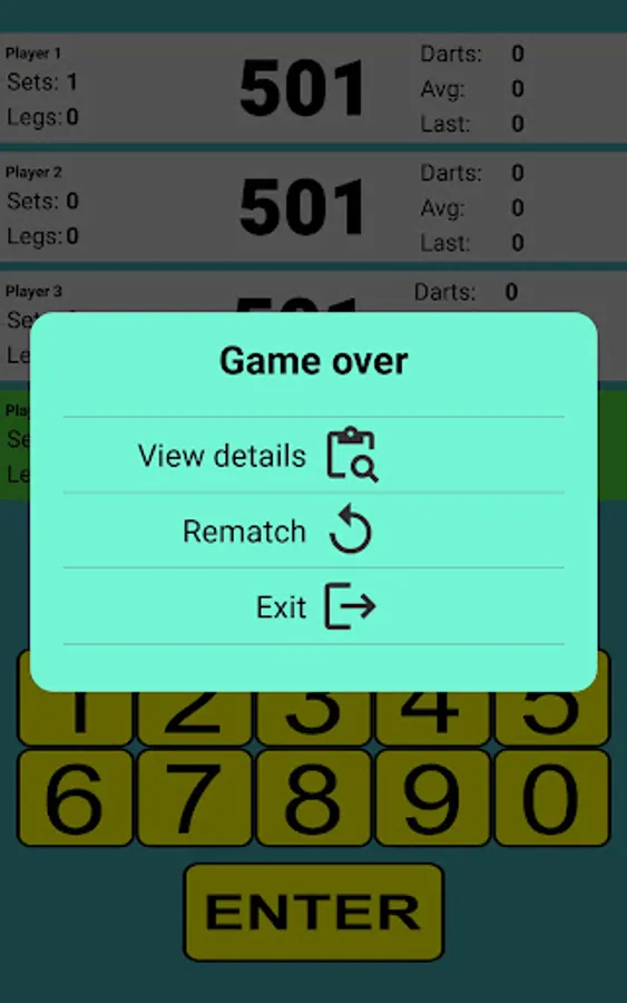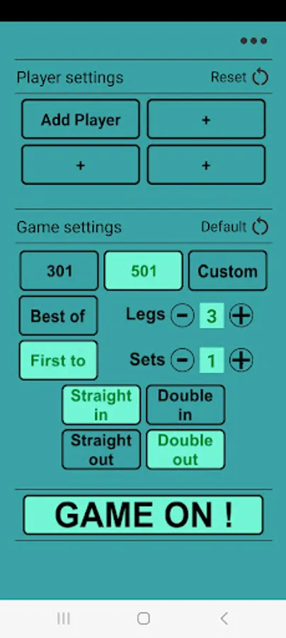 Darts Counter, an essential and daily use app for those who play darts. Easy to set up and use. You can choose between 301, 501 or "Custom" mode, start "Straight in" or "Double in", finish the game in "Double out" or the easier "Straight out". "Legs" and "Sets" can be won in "Best of" or "First to" mode. You can add players as "Guest" if they are casual players or you can store them in the device. The app allows you to play alone, with two, three or four. You can change the starting order of the players and if necessary the "Memory down" button takes you back as many tosses as you like. At the end of the game you can choose to look at a simple summary of each player's leg wins, choose a rematch or end the game.