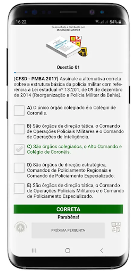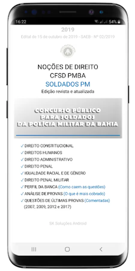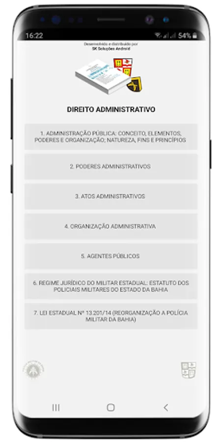 When acquiring the tool, the candidate will have access to all content, such as, Notions of Constitutional Law, Notions of Human Rights, Notions of Administrative Law, Notions of Criminal Law, Notions of Racial and Gender Equality and Notions of Criminal Law Military.