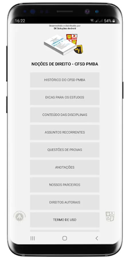 "Direito CFSD PMBA" is an application for the Android platform that brings a vast material of all the syllabus content of the Notions of Direct discipline required by the bank of the aforementioned event, while maintaining the quality, as it is an organized syllabus and updated by those who have already been approved and who understand the subject the most.