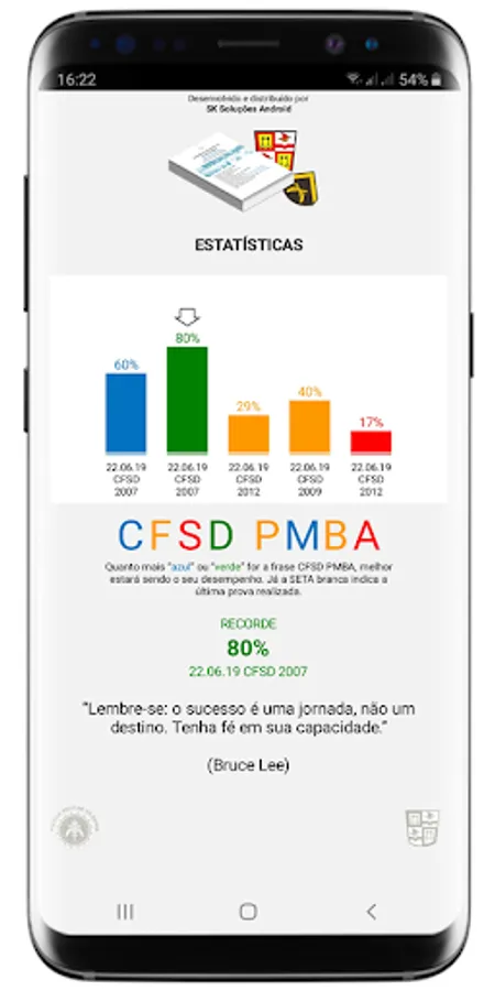 At the end of each of the question banks, which simulate a CFSD PMBA Contest Law test, a bulletin will be generated with the number of correct answers, errors, performance classification, total test time, tips for improving such performance and phrases of encouragement and motivation.