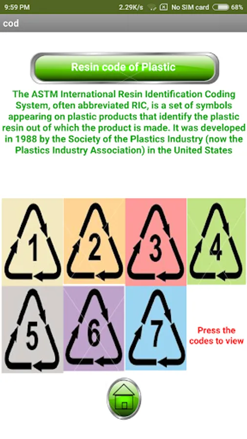 The ASTM International Resin Identification Coding System, often abbreviated RIC, is a set of symbols appearing on plastic products that identify the plastic resin out of which the product is made. It was developed in 1988 by the Society of the Plastics Industry (now the Plastics Industry Association) in the United States