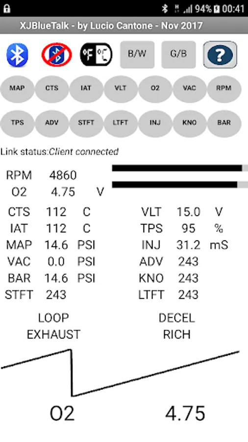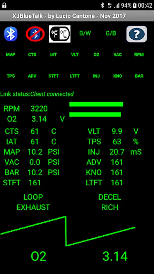 Monitored sensors are: MAP, CTS, IAT, VLT, O2, VAC, RPM, TPS, SparkADV, Loop Mode, Exhaust, InjPulse, Knock, Baro, STFT and LTFT.