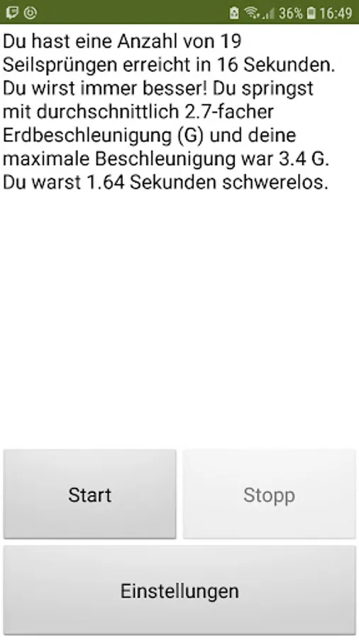 Jumping rope is a sport that is often underestimated. It's twice as effective as jogging and you can do it in the smallest apartment. I programmed an app that counts and analyzes rope jumps. In my app you can set time limits, number of jumps and voice output. I tried different cell phone sensors and found the accelerometer. Looking at the measurement results, I discovered that each rope jump has a similar sequence of acceleration values. When analyzing the measured values, which are between -2m/s² and 40m/s² (i.e. 0 to 4 times the acceleration due to gravity or 0G-4G), I noticed that these are the same accelerations as in astronaut training: In the Centrifuge you have to endure 4G to 5G, with parabolic flights you reach 0G and simulate weightlessness. My app not only measures the number of jumps, but also the G-value you jump off with and how long you are weightless.