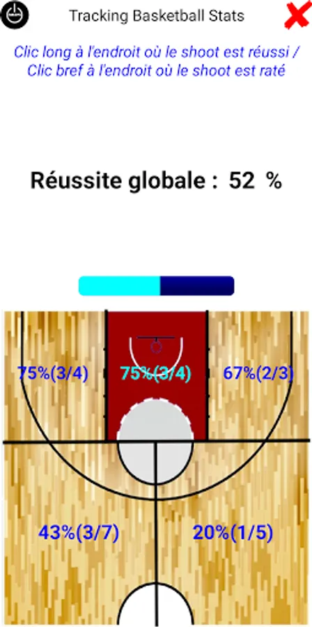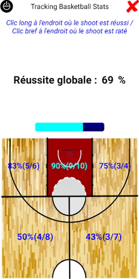 Long click where the shot is successful / Short click where the shot is missed: allows to obtain in real time the statistics of success of the shots carried out by zones.