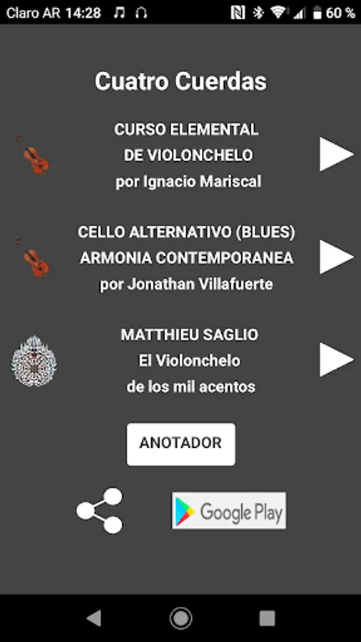 App for violoncello lovers. Elementary course includes cello by Ignacio Mariscal / Tutorials Blues and contemporary harmony by Jonathan Villafuerte.