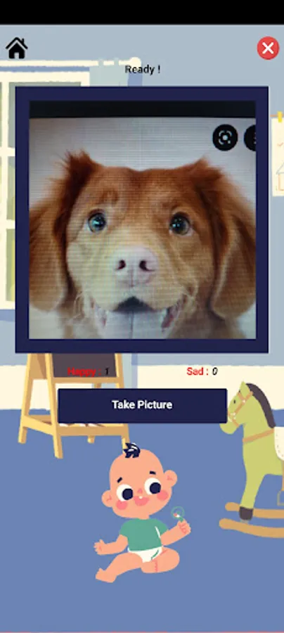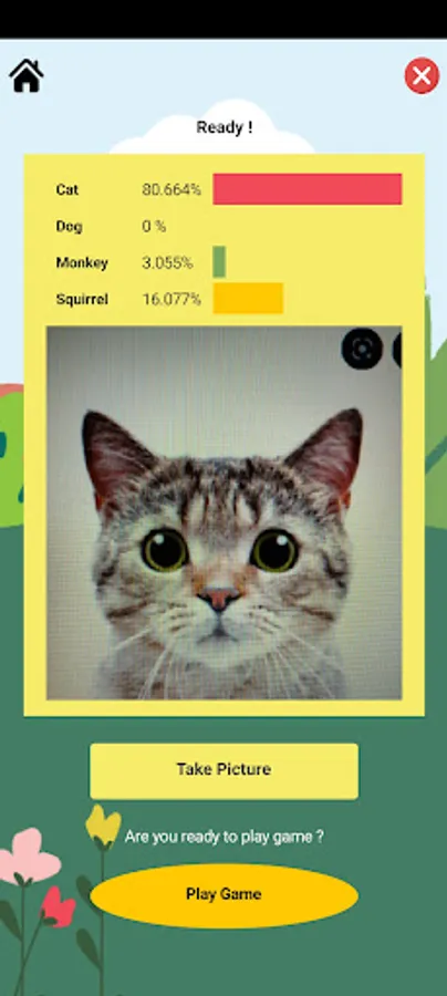 3. On the Animal Recognition screen, users need to click the Take Picture button to capture an image of an animal. The result of the image detection will be displayed on the screen based on the three highest percentages of confidence level. Users also can click the Play Game button to go to the Game screen.