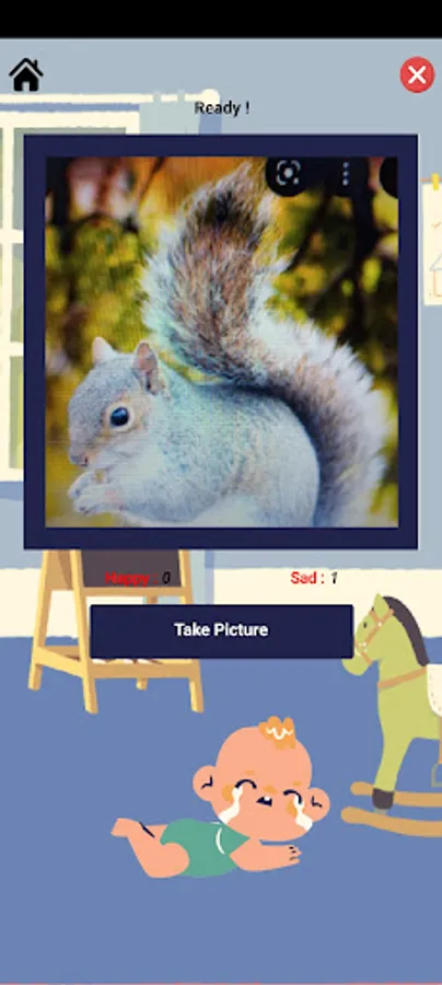 4. On the Game screen, the users need to click the Start button to start playing the game. An instruction and hint are provided. The baby loves cats and dogs but hates monkeys and squirrels. Users can click the Play Again button to reset the game.