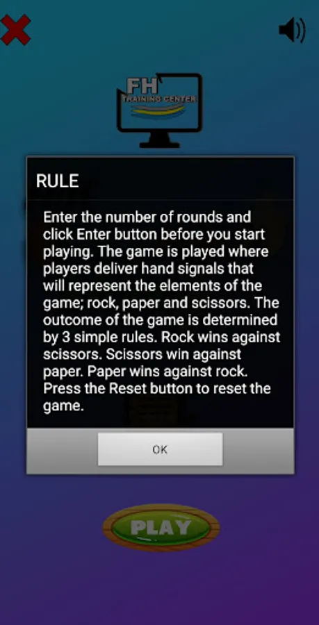 2. In the main menu, click the Rule button to understand the rules of the rock, paper, scissors game. To mute the background music in the main menu, click the speaker icon on the top right corner of the screen. You can click the Play button to go to the Play Screen.