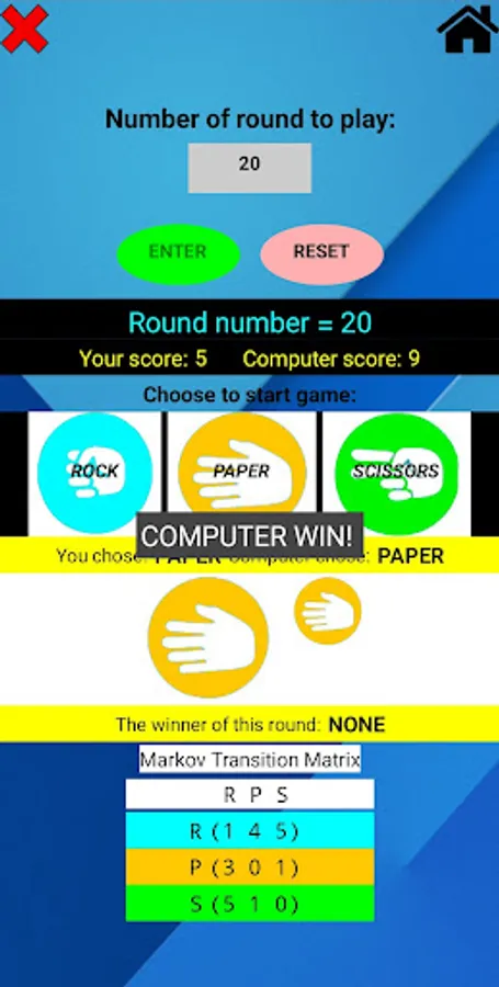 The secret behind the AI is just a simple calculation called the Markov Transition Matrix that will count your choice and add information into a 3x3 table. The row and column will be filled with your choices. The more you play, the more numbers will add up into the table. With this method, the AI can predict your next choice and will find the best choice to beat you in this game.